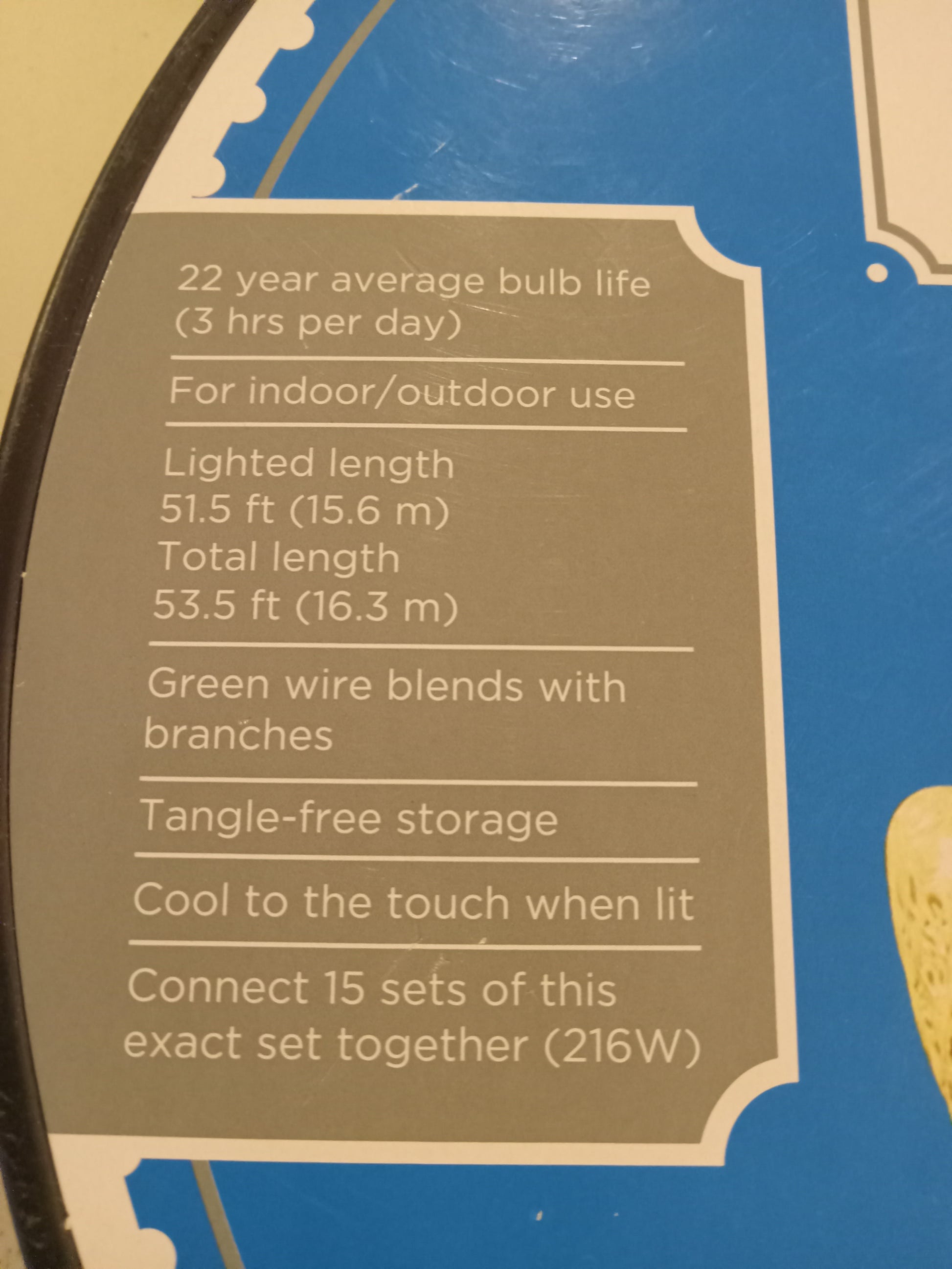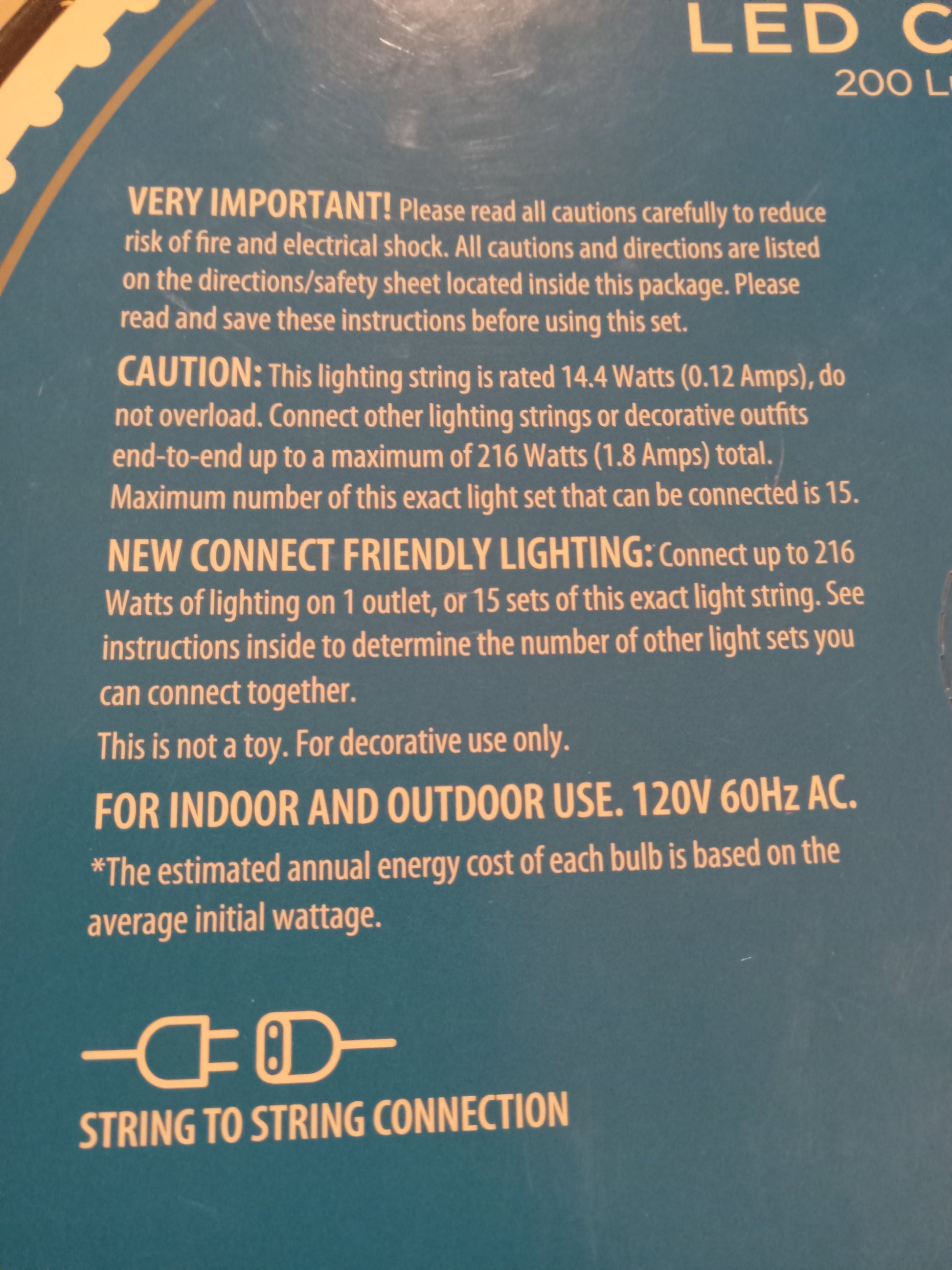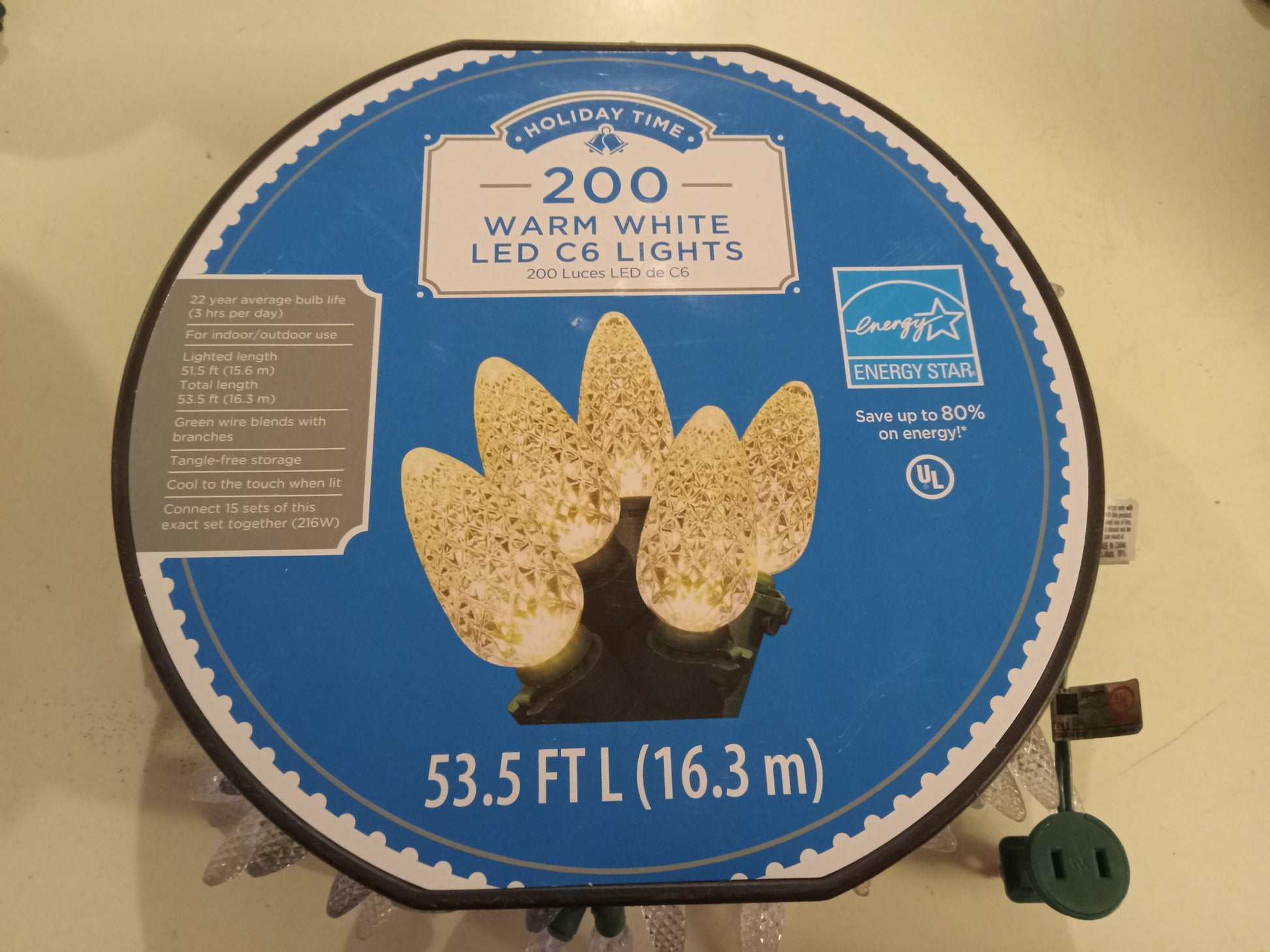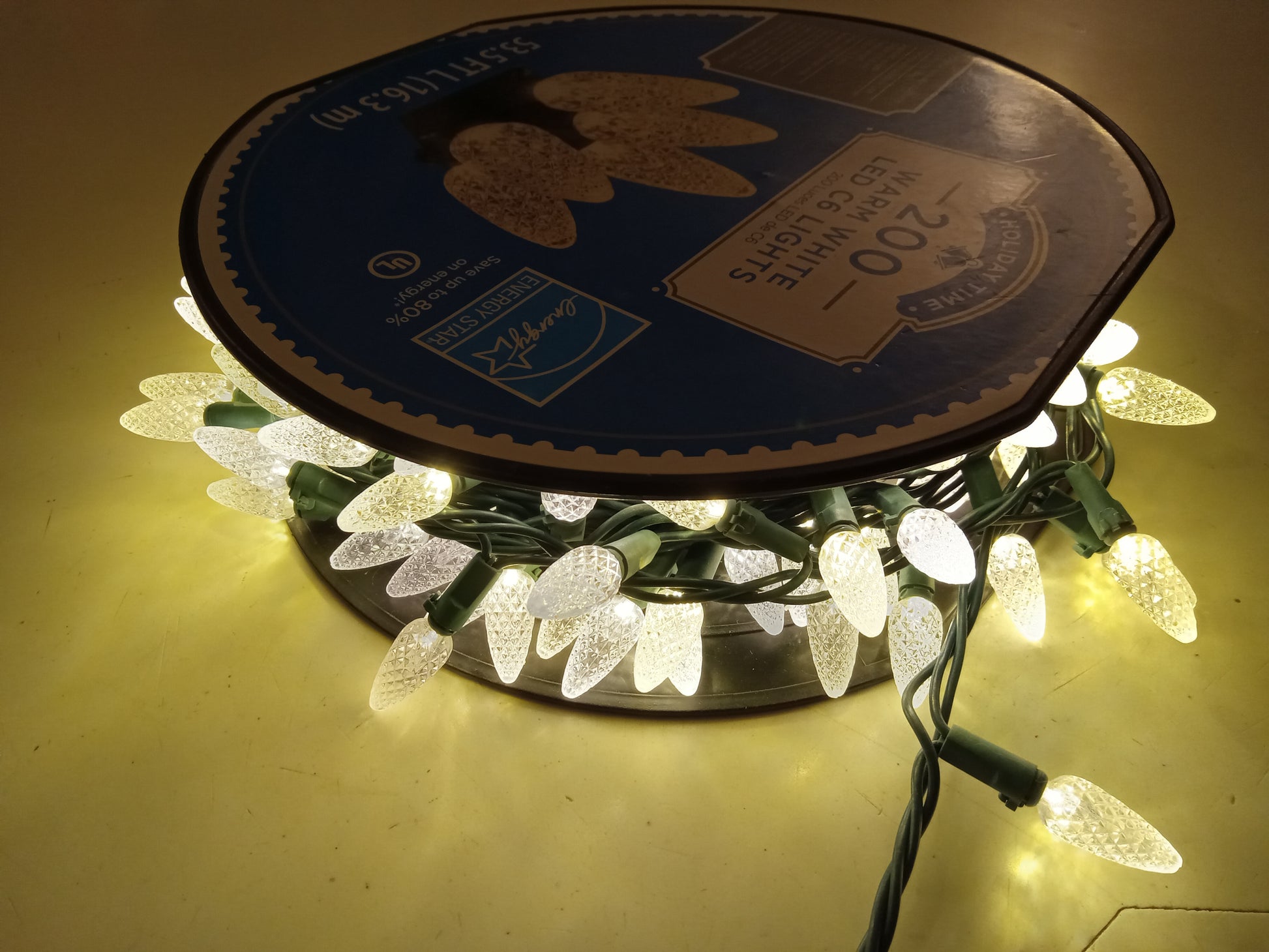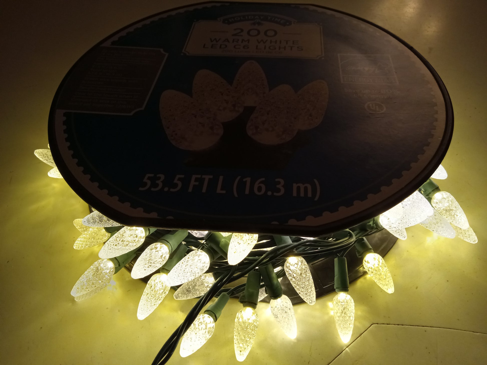 Christmas Lights roll by Holiday Time of 200 LED C6 bulbs, warm white, on green wire, indoor and outdoor.