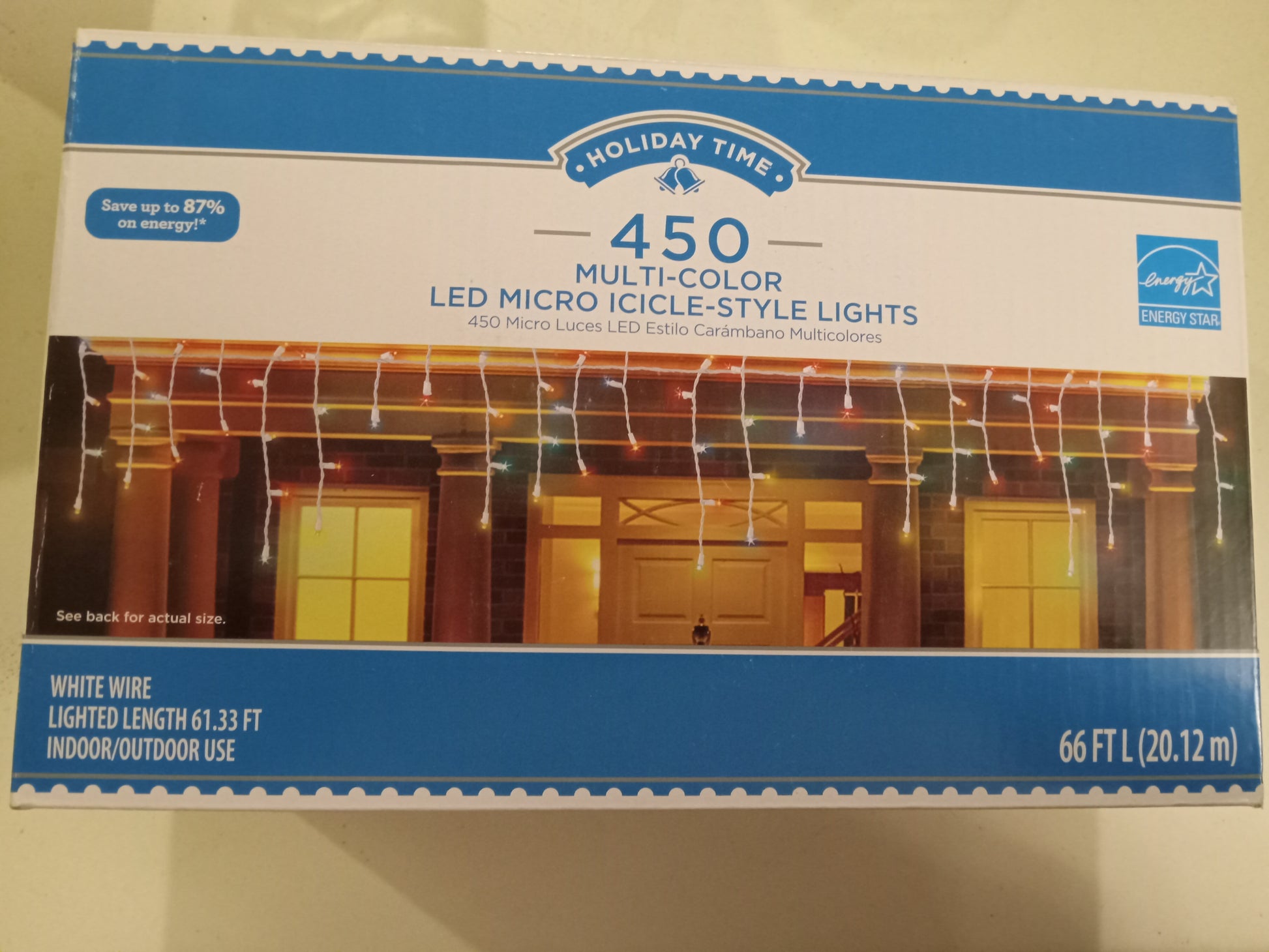 Christmas Lights, 70/450 LED Icicle Lights, Multi-Color/Cool White, White Wire, Holiday Time, NEW