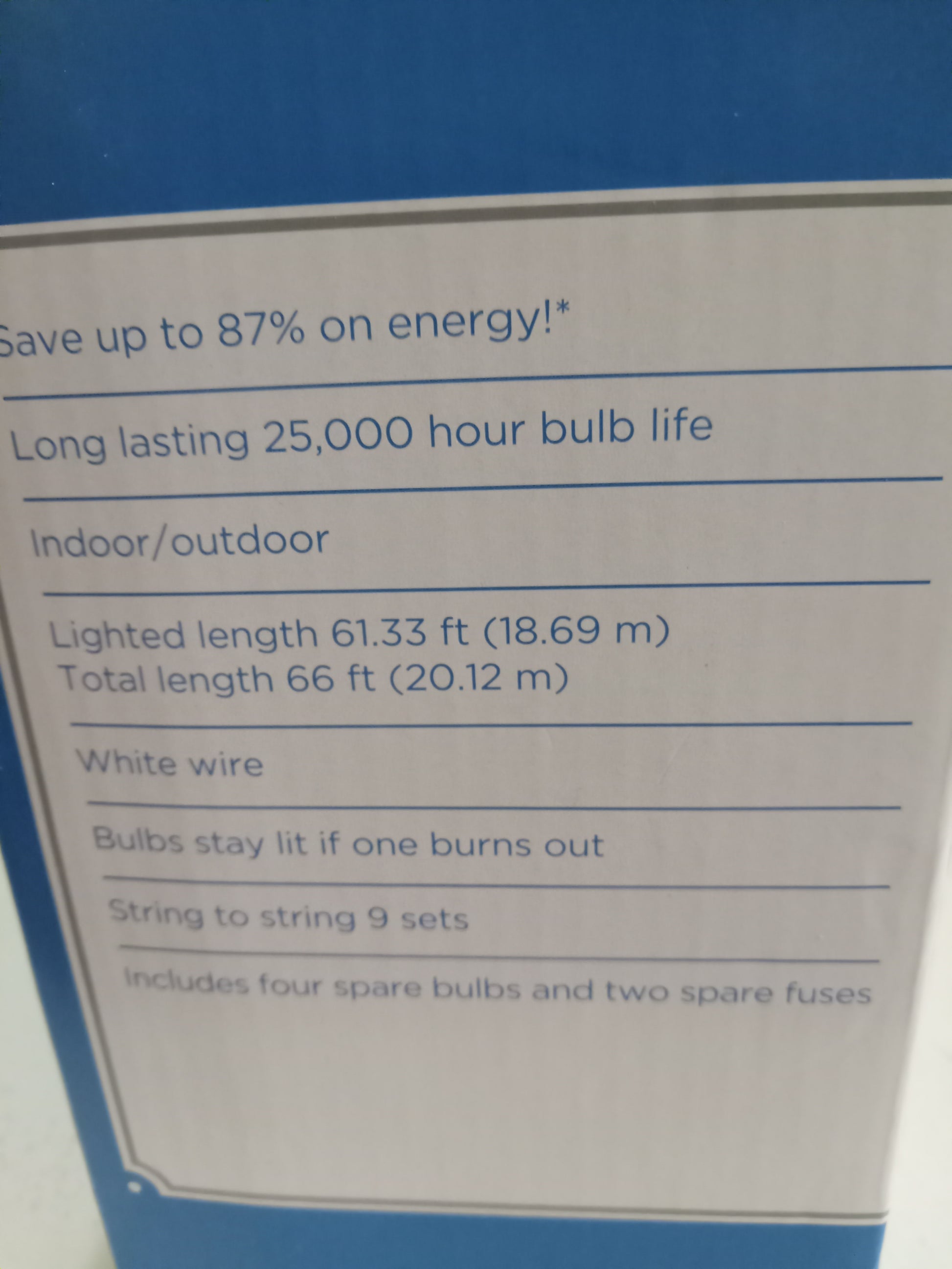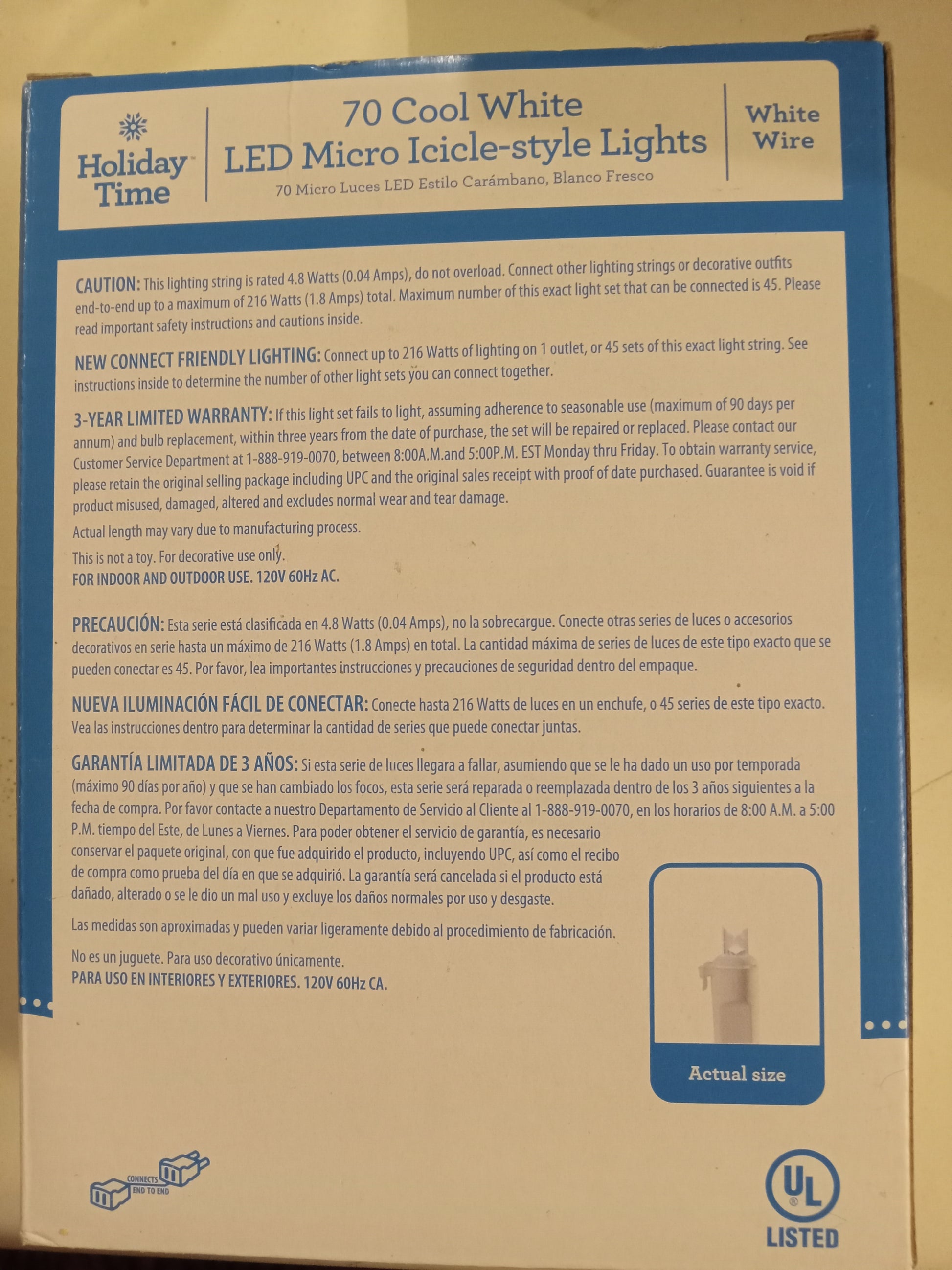 70 Cool White: 70 Cool White LED micro Icicle lights, white wire, 11.42ft (3.48 m) connect up to 45 sets together.