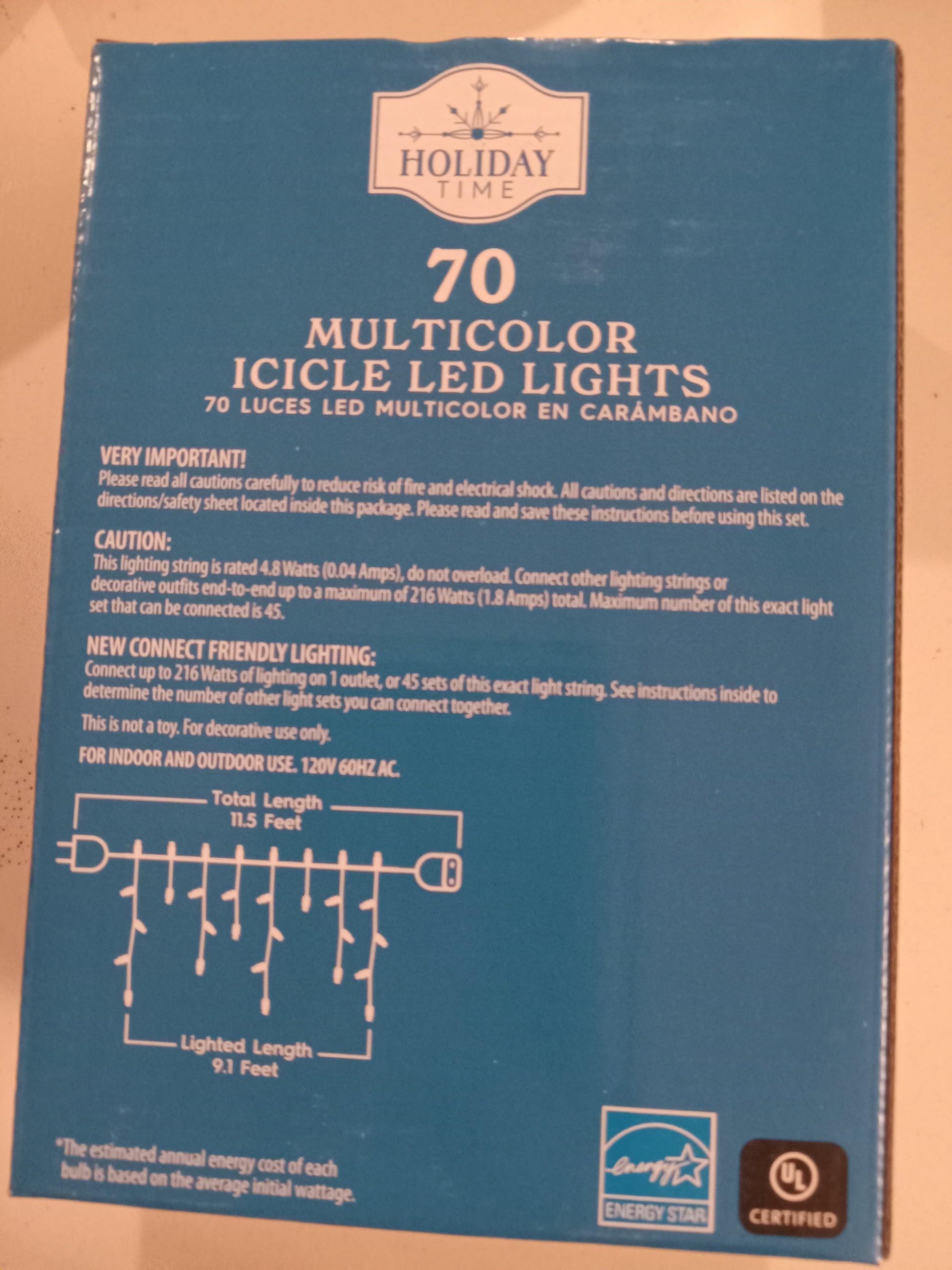 70 Multi-Color: 70 Multicolored LED micro Icicle lights, white wire, 11.5ft (3.5 m) connect up to 45 sets together.