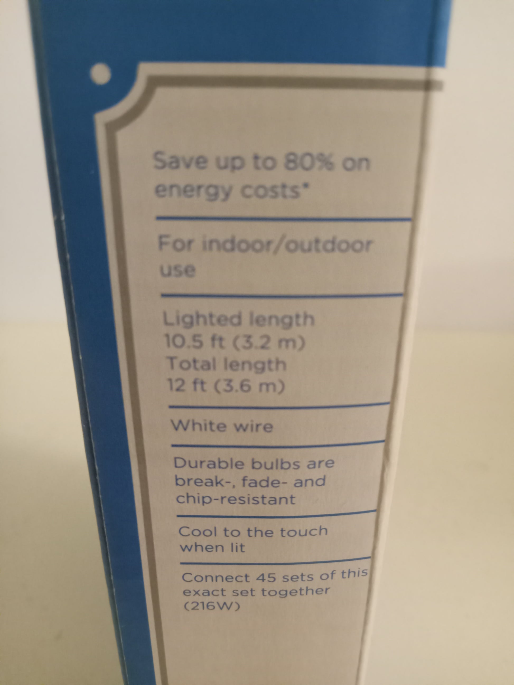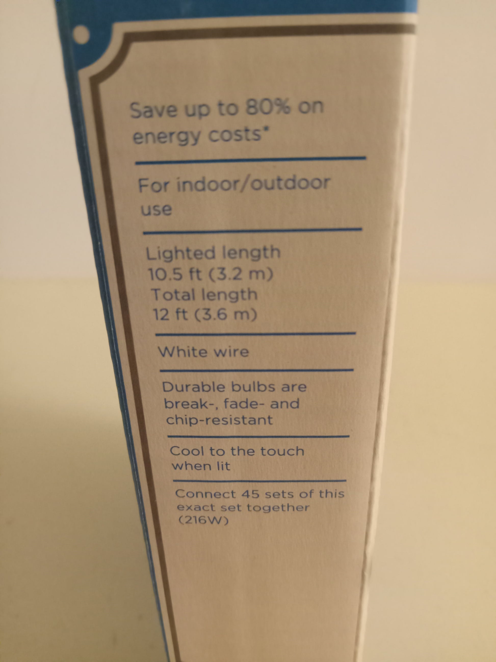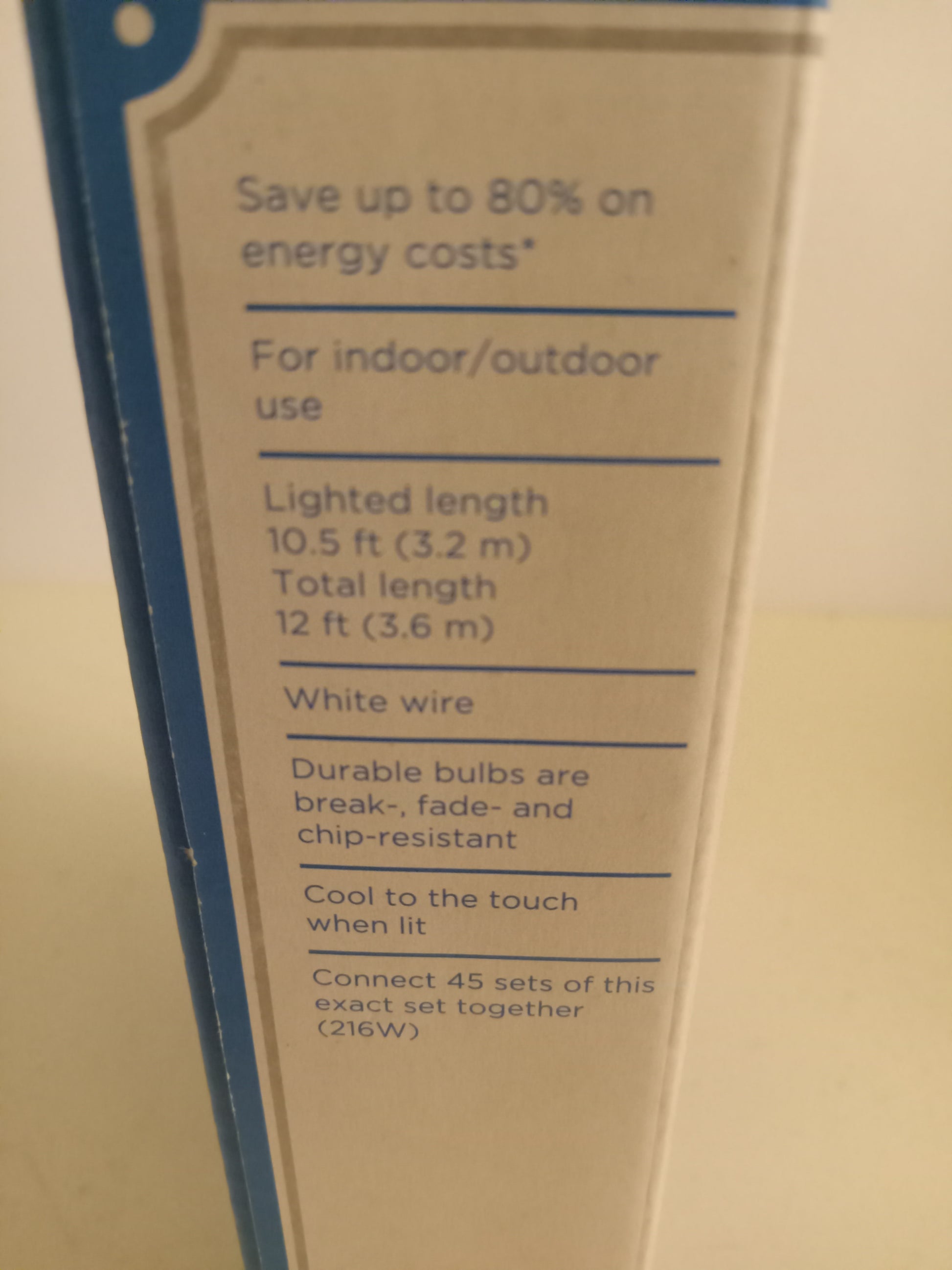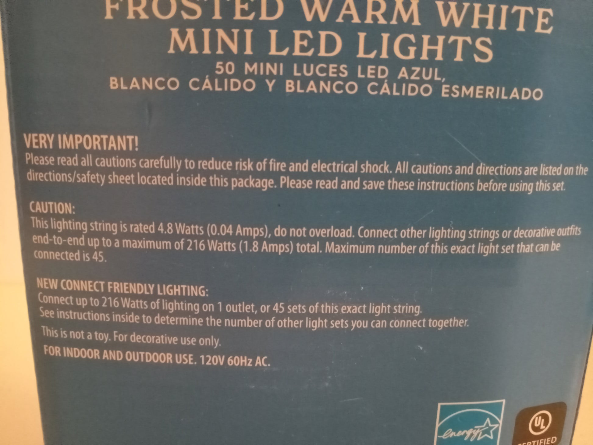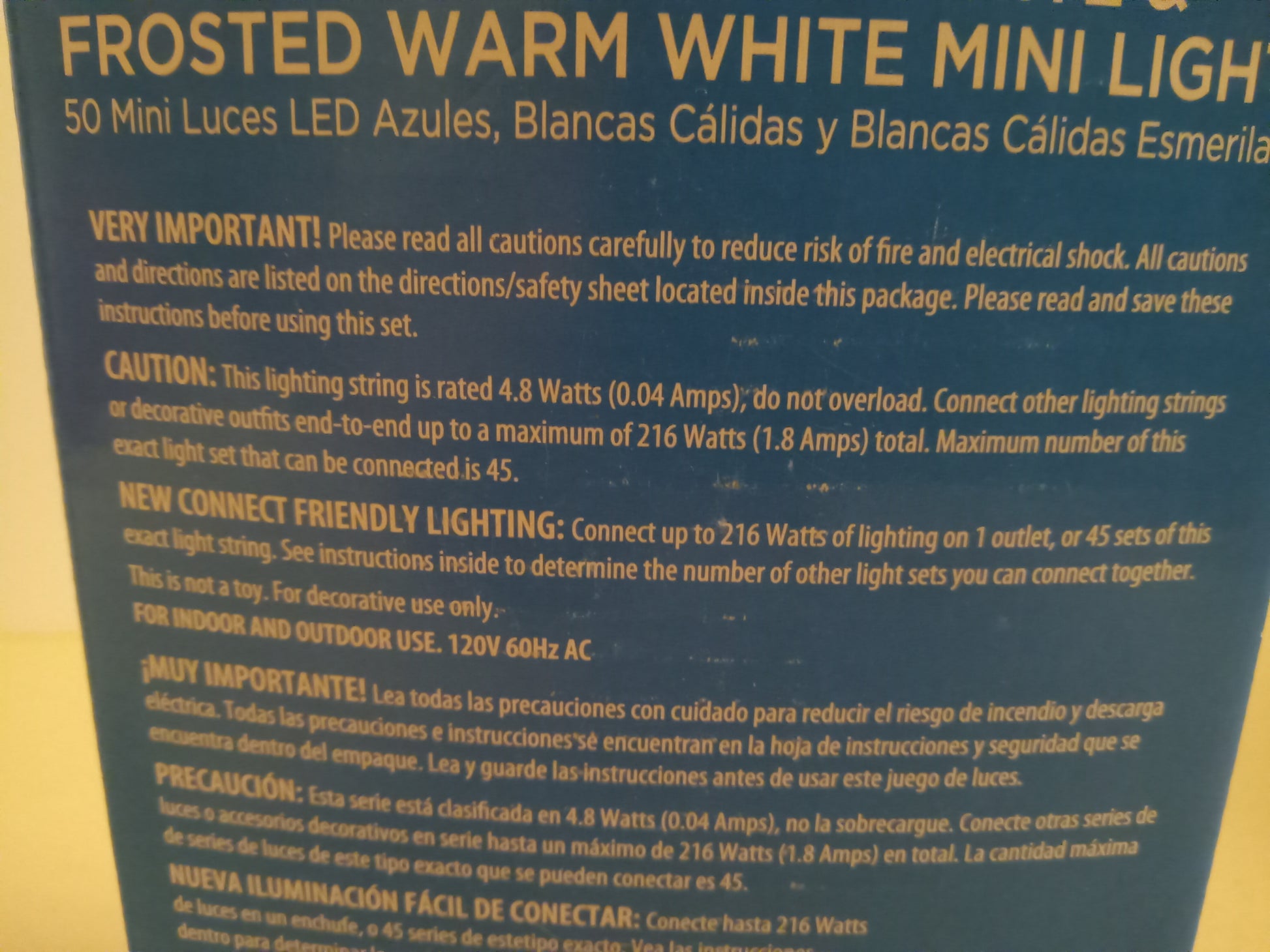50 Blue/Warm White/Frosted White (10.5ft): 50 LED Blue, Warm White, and Frosted Warm White lights on white wire, lighted length 9.5ft, connect up to 45 sets together.