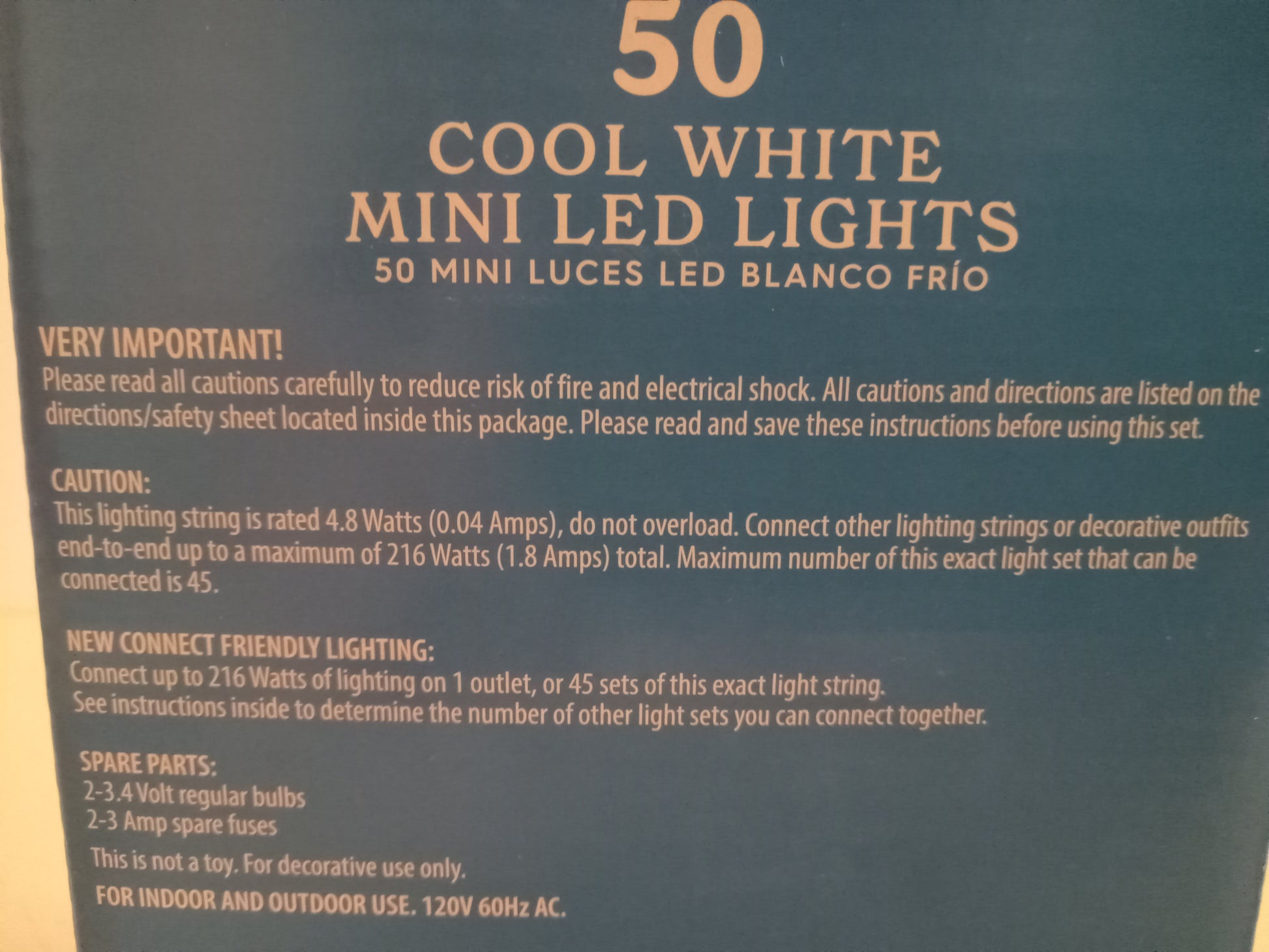 50 Cool White (11.2ft): 50 LED Cool White lights on white wire, lighted length 11.2ft, connect up to 45 sets together.