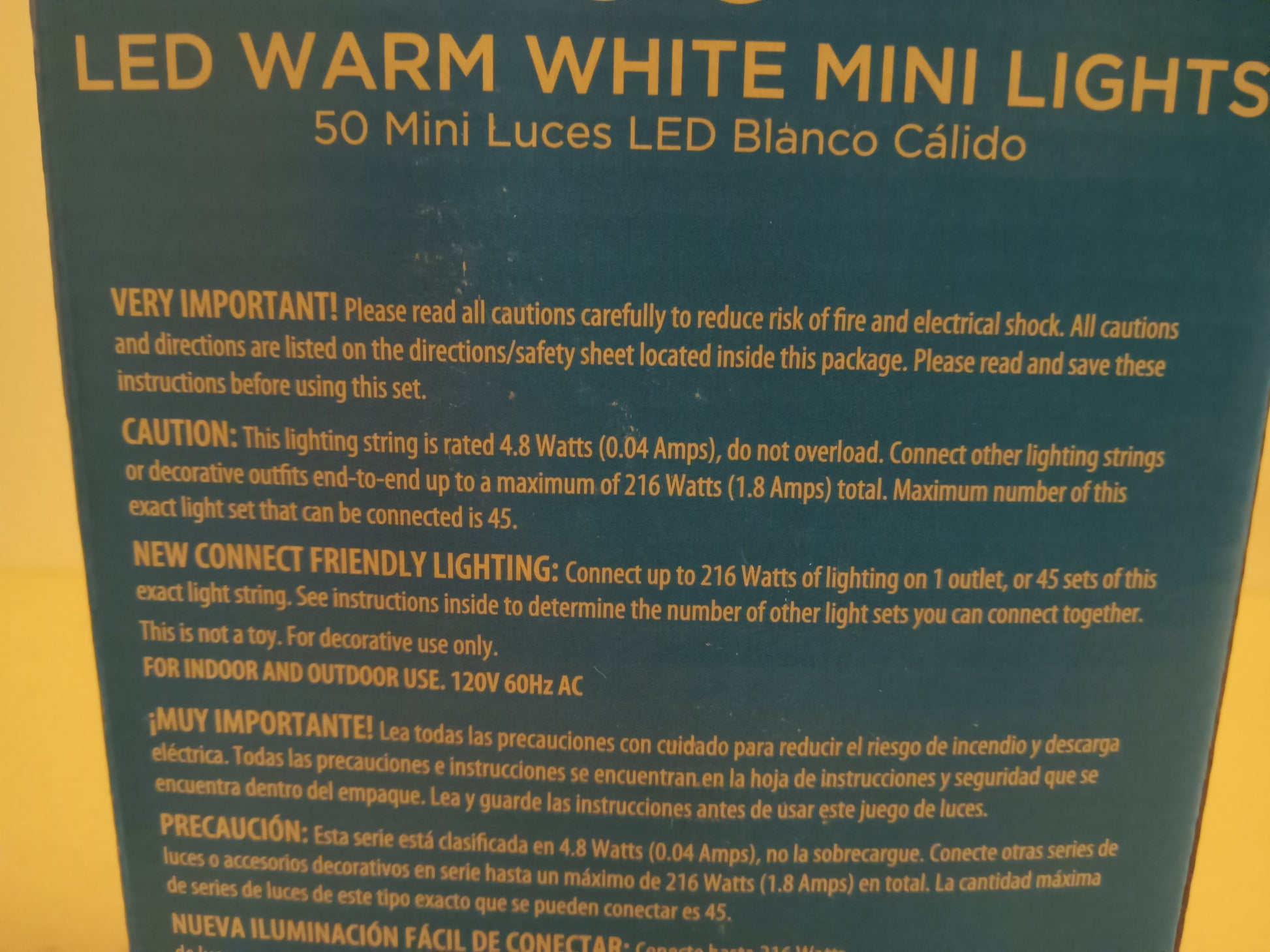 50 Warm White: 50 LED Warm White lights on white wire, lighted length 10.5ft, connect up to 45 sets together.