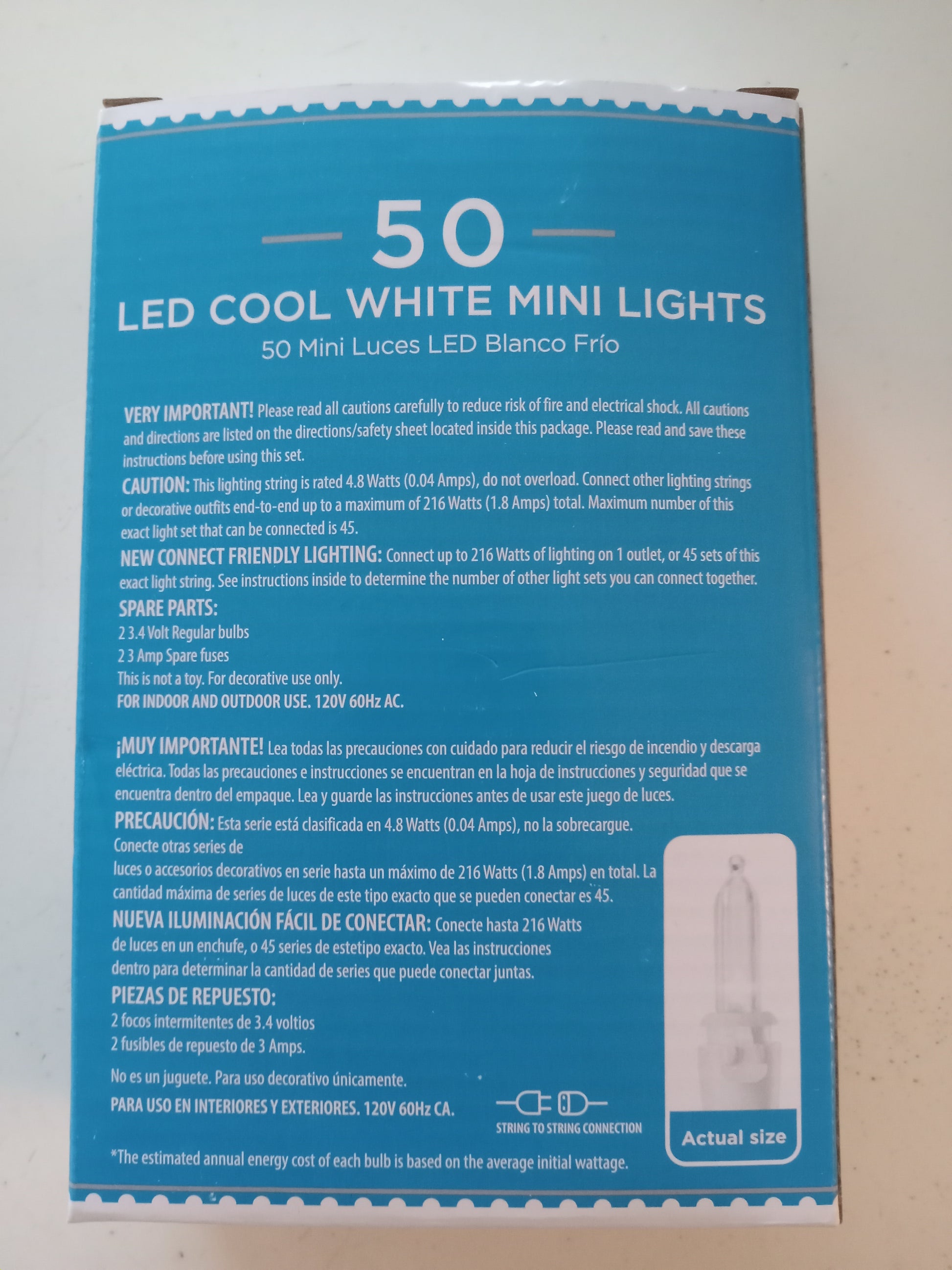 50 Cool White (10.2ft): 50 LED Cool White lights on white wire, lighted length 10.2ft, connect up to 45 sets together.