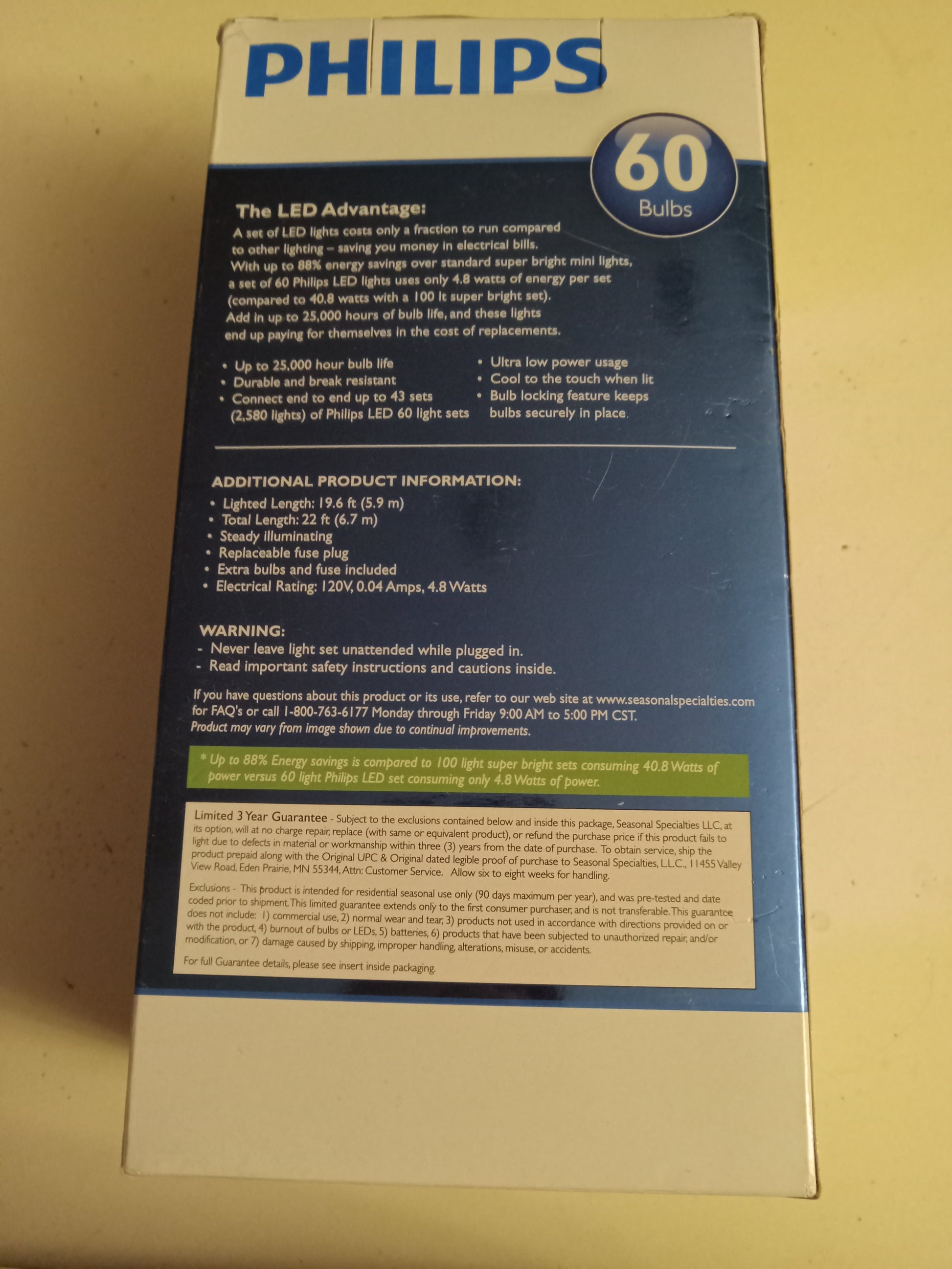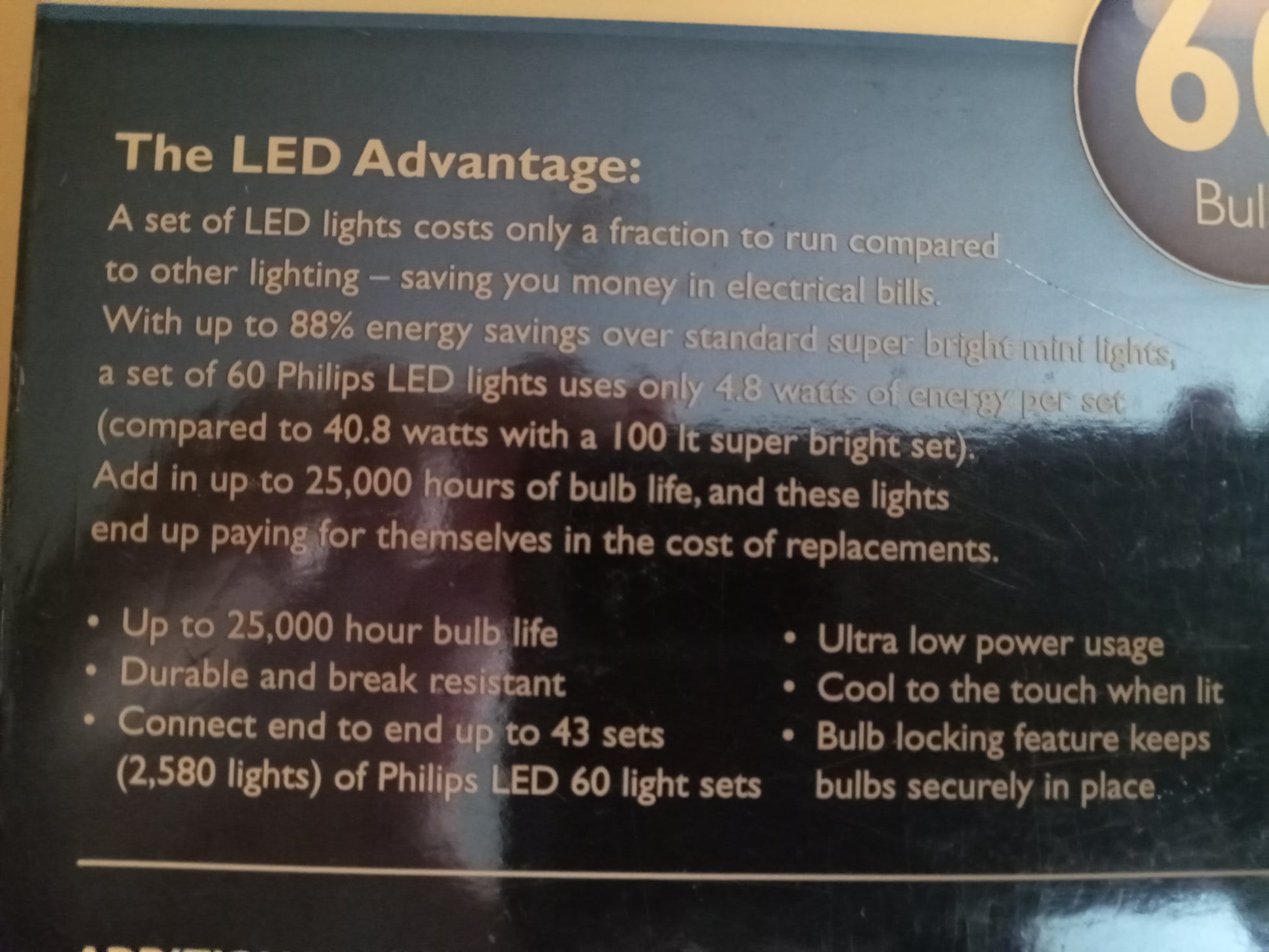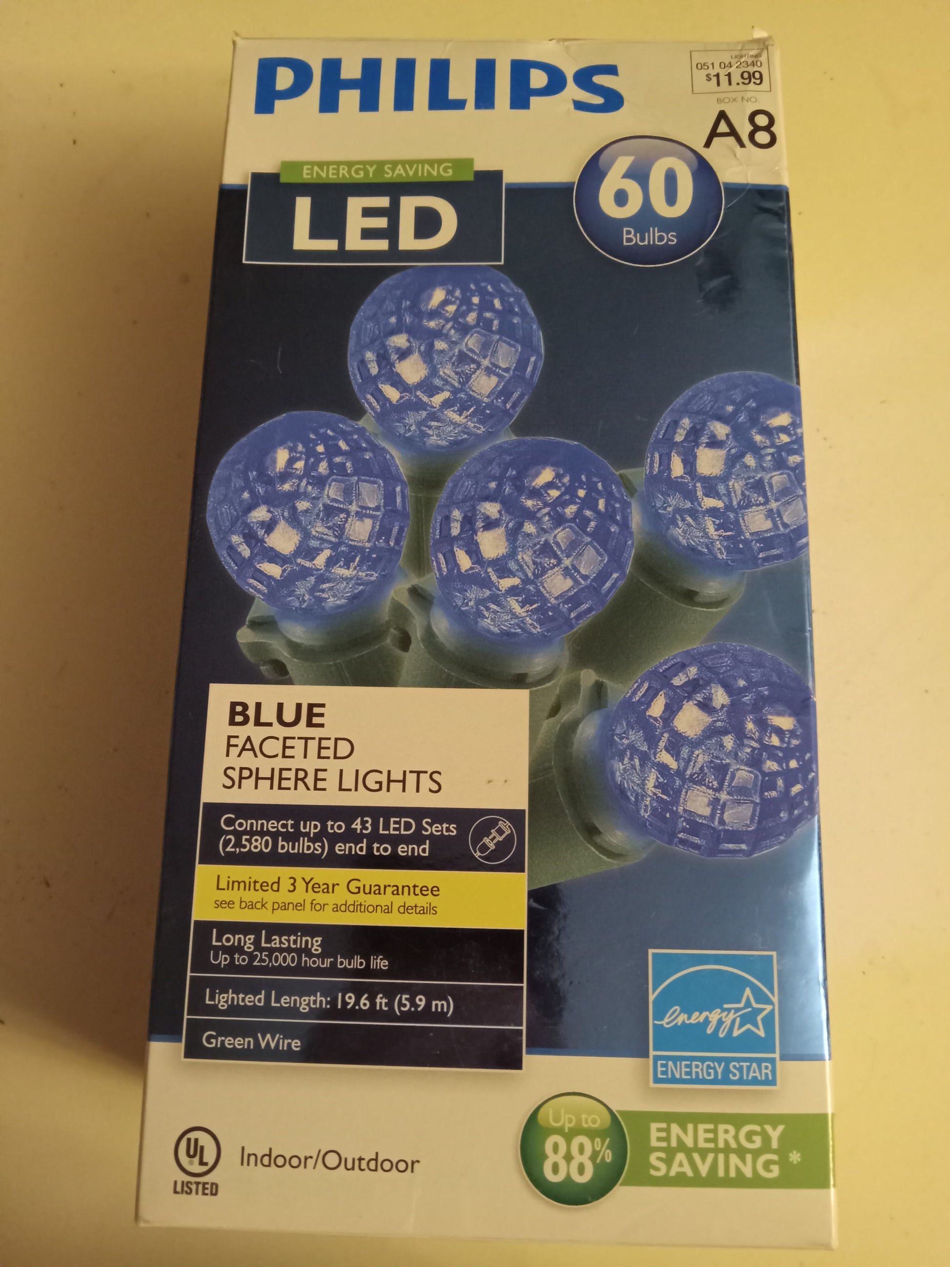 Christmas lights by Philips: 60 Blue LED's with Faceted Sphere A8 lights, Green wire, Indoor/Outdoor.