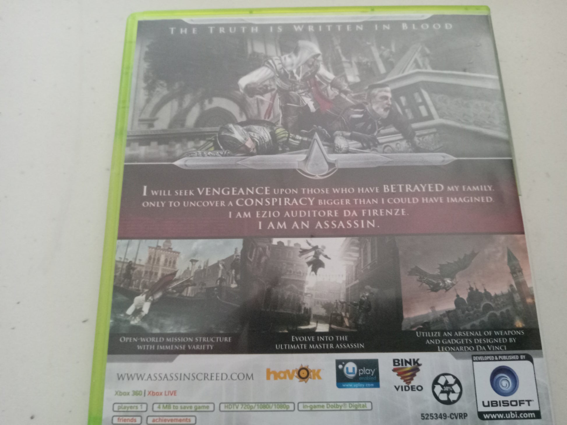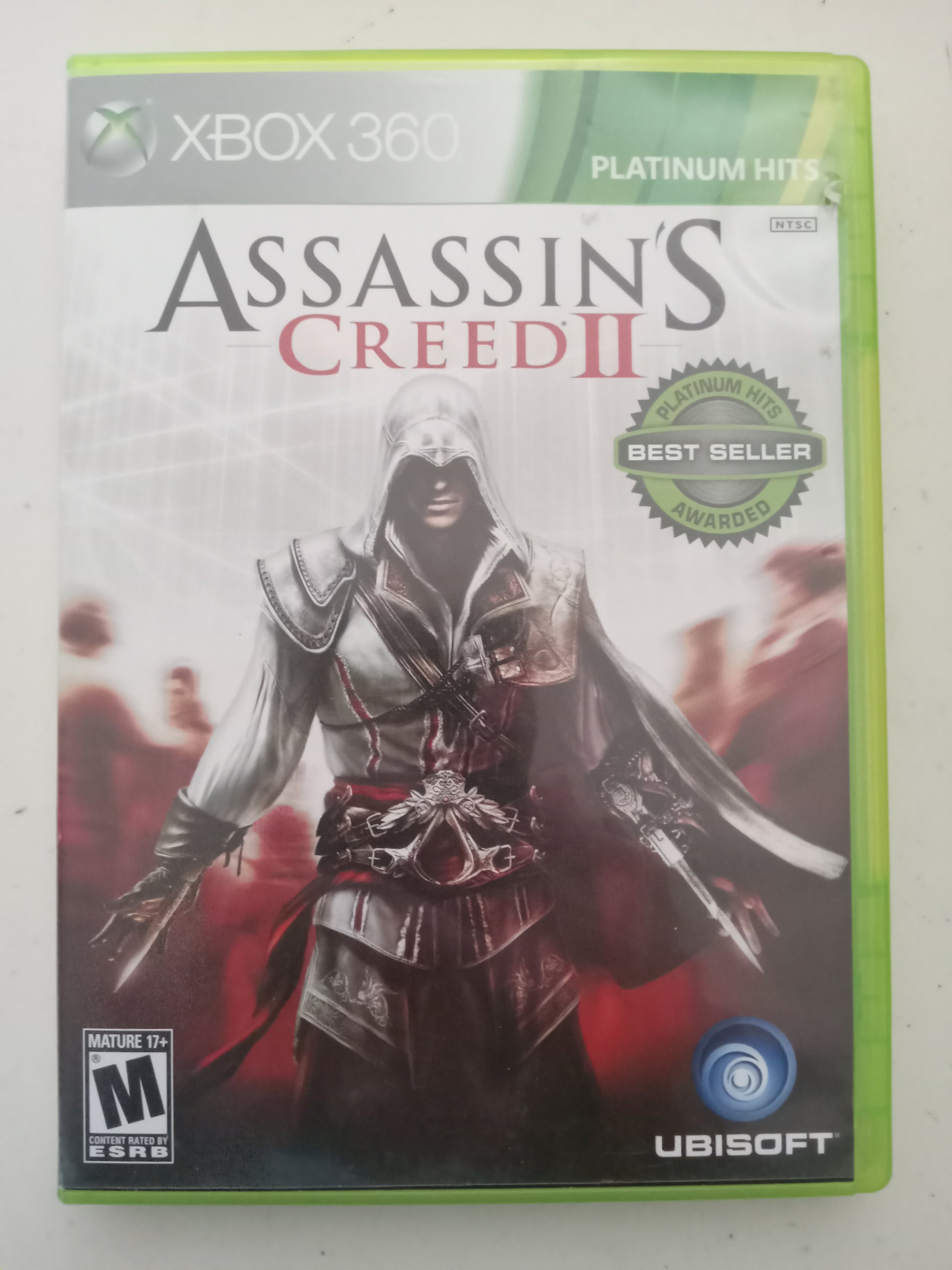 Assassin's Creed II 2, Xbox 360 Video Game, Rated M, USED. This item is used in great condition. Game disc is in good condition with only a few small minor scratches and guaranteed to play with no problems. Case is in good condition with some wear, small torn hole in the clear sleeve on the back cover bottom right, and scuffs.