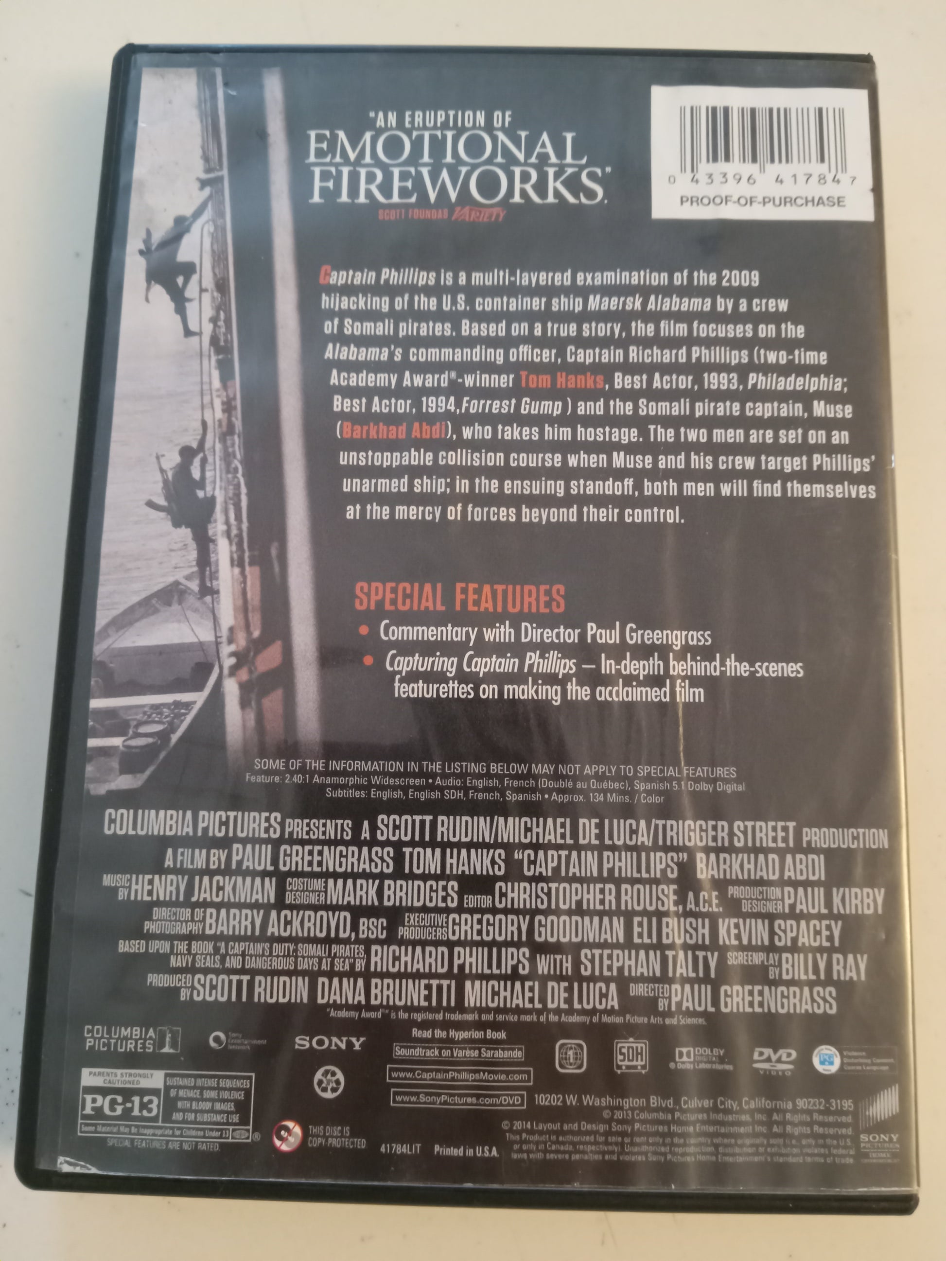 Captain Philips DVD Movie, Tom Hanks Widescreen, Rated PG-13, USED