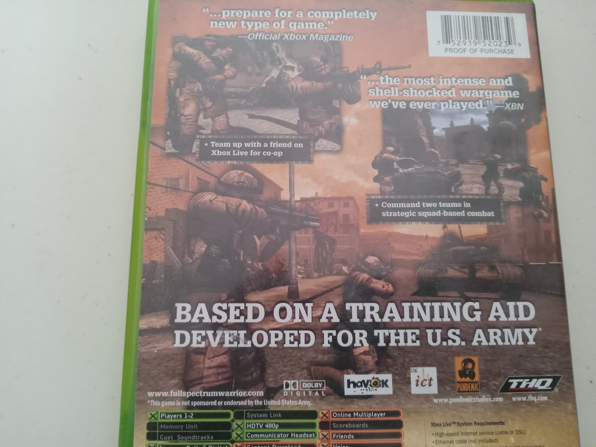 Full Spectrum Warrior, original Xbox Video Game, Rated M, USED. This item is used in great condition. Game disc is in good condition with only one minor scratches and guaranteed to play without any problems. Case is in great condition with light minor wear and scuffs.