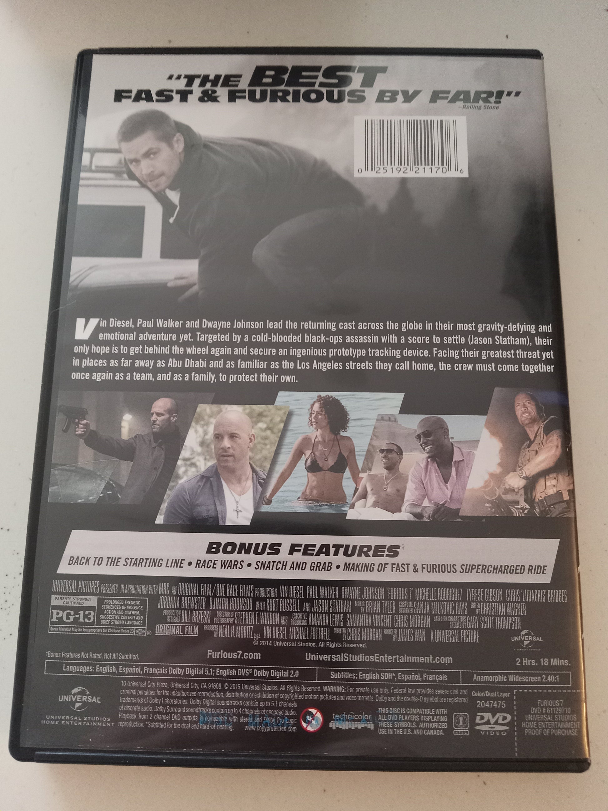 Furious 7, DVD Movie, Vin Diesel Widescreen, Rated PG-13, USED