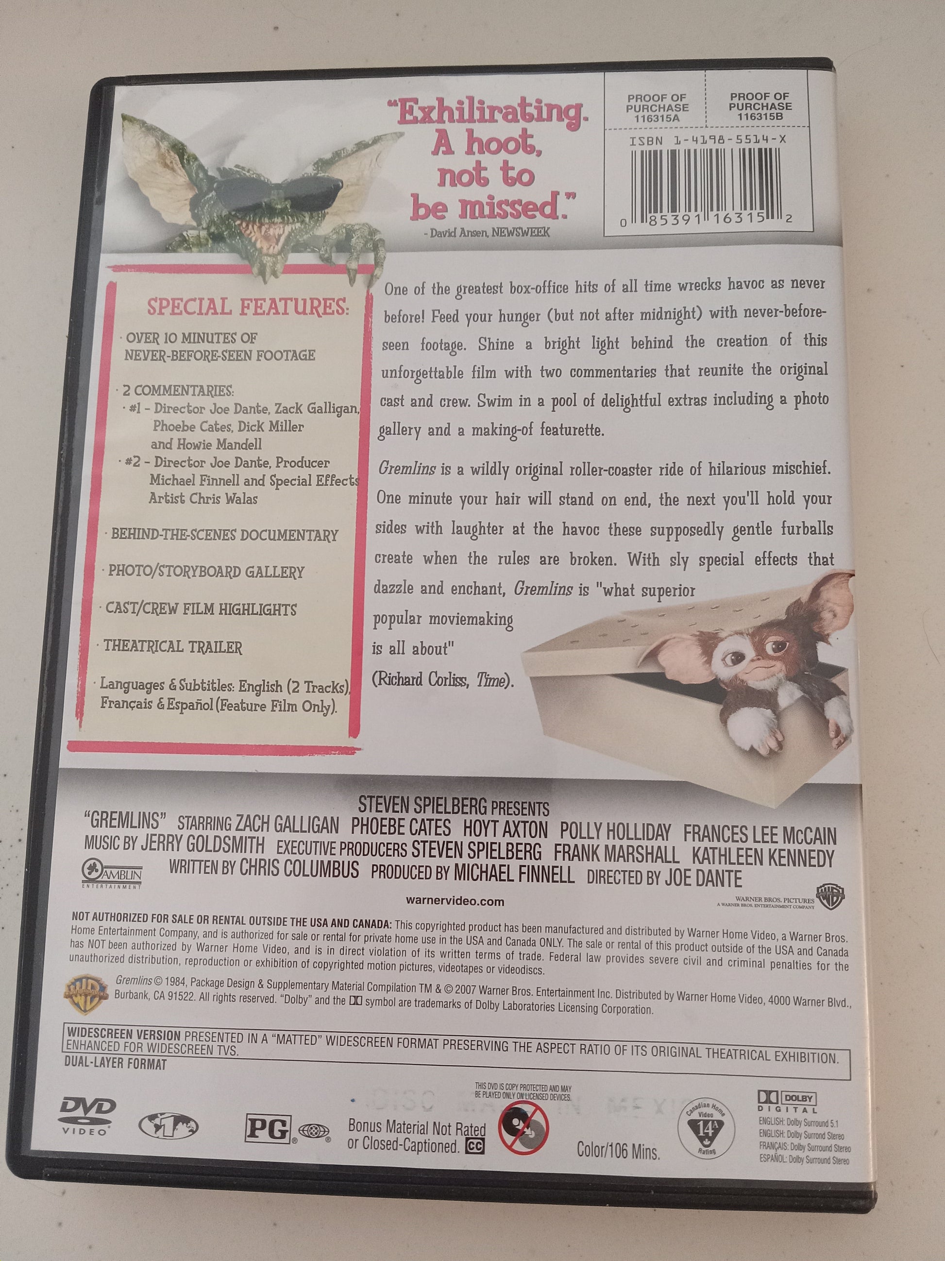 Gremlins, DVD Movie, Steven Spielberg Widescreen, Rated PG, USED.