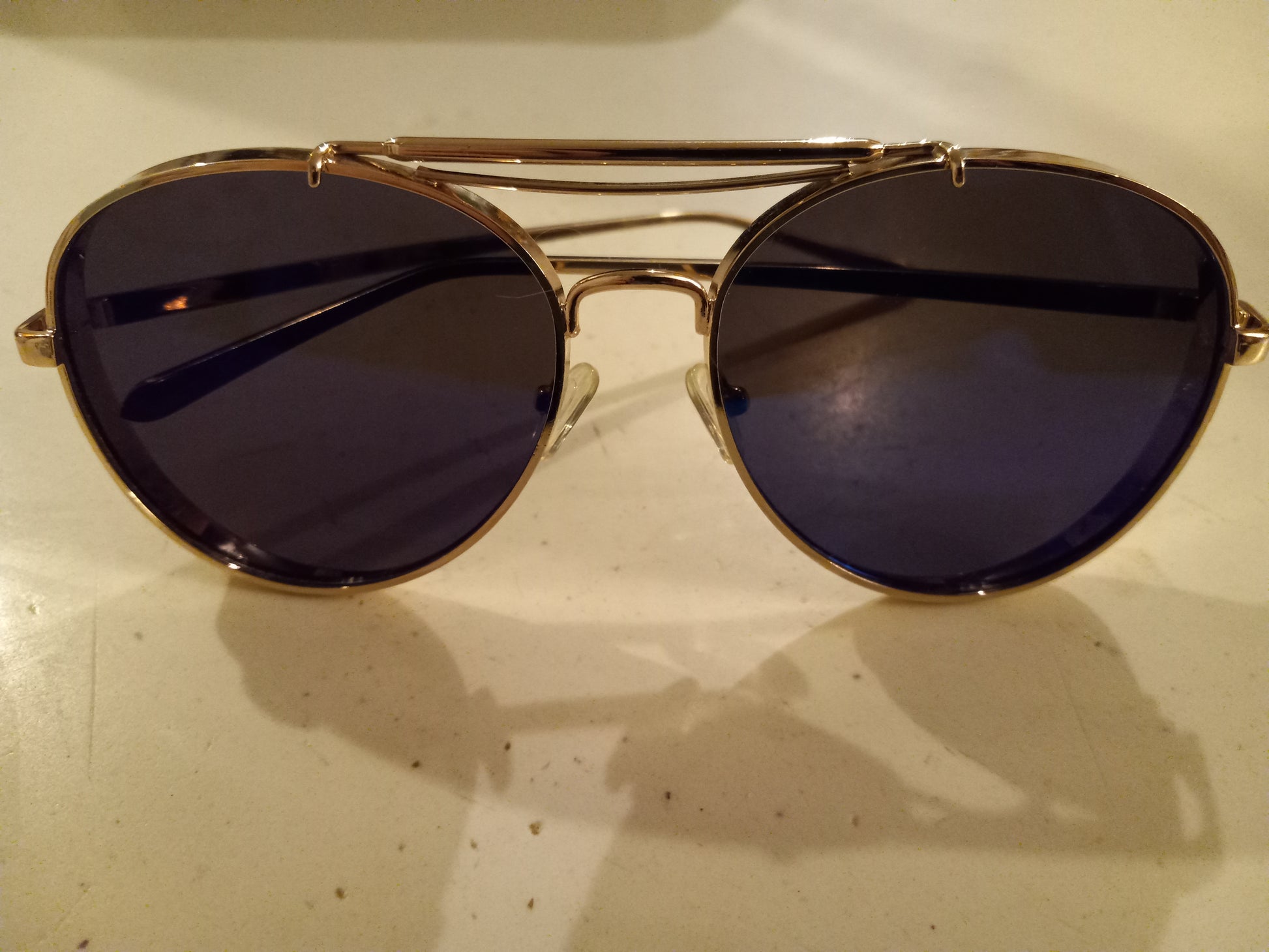 Iridescent Shades, Dark Sun Glasses, Blueish Purple Lens, Gold Frame, Thick Bulky Style USED