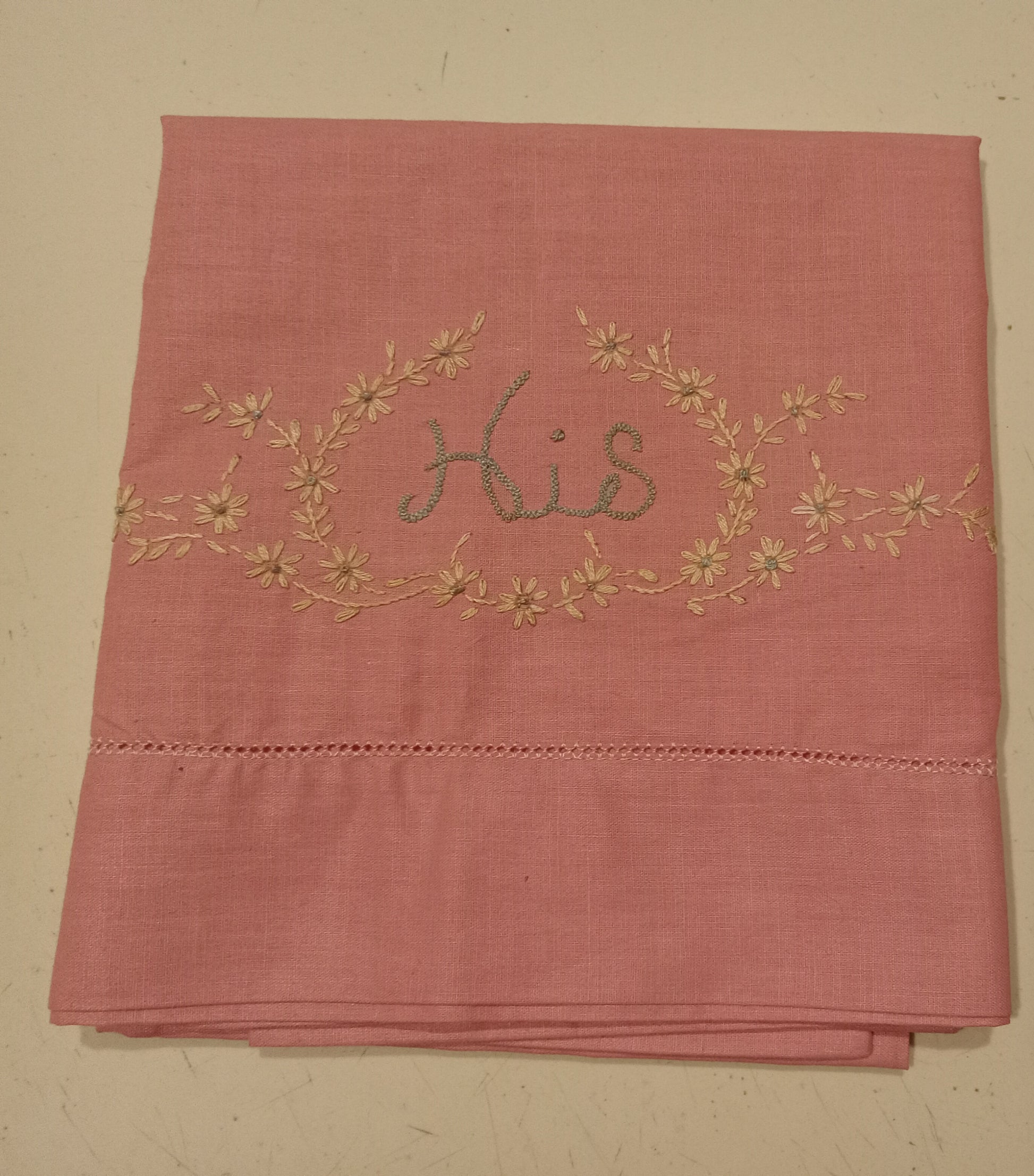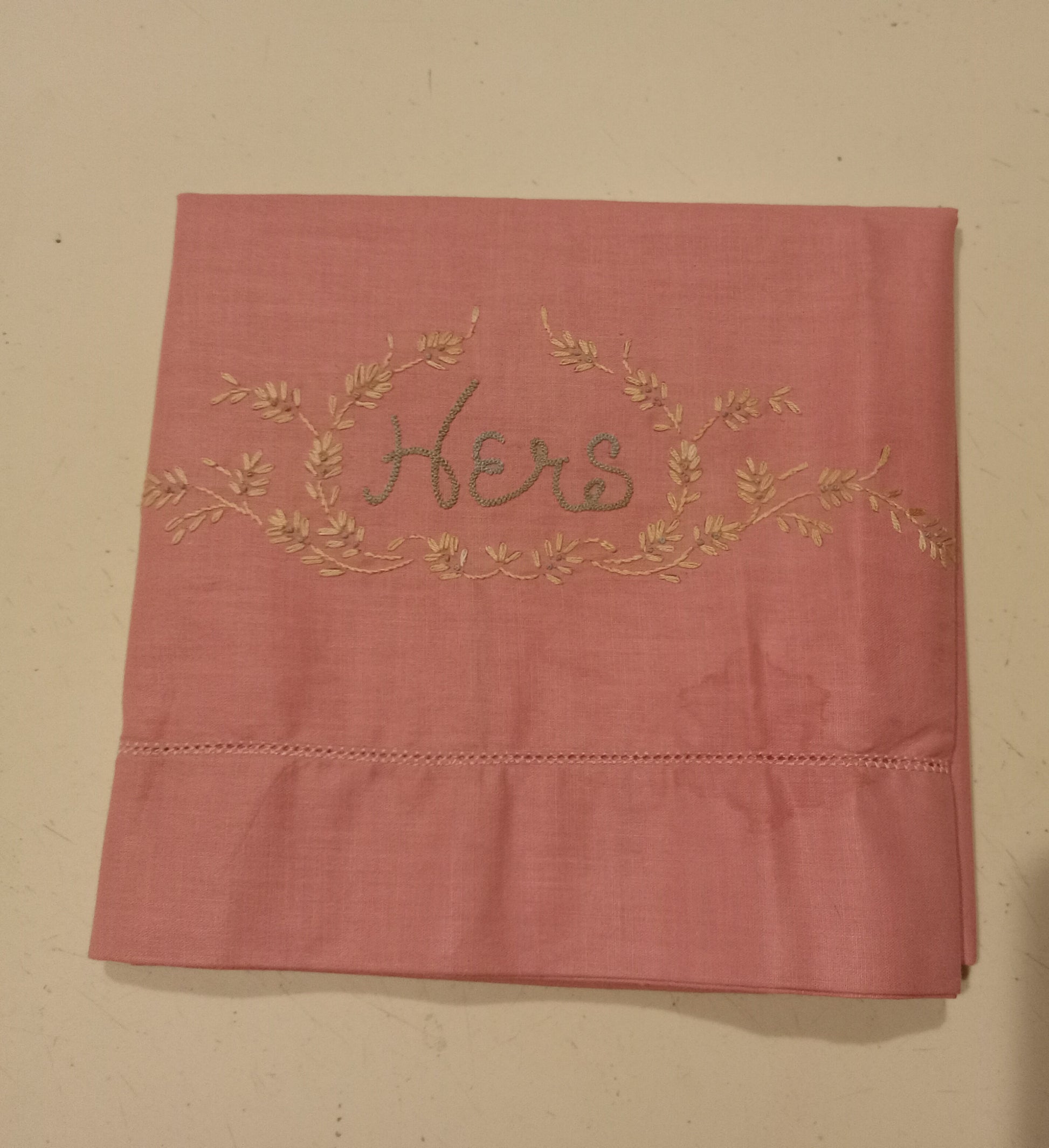 2 large Pink His and Hers Embroidered 32"x20" Couples Pillowcases, Like New.