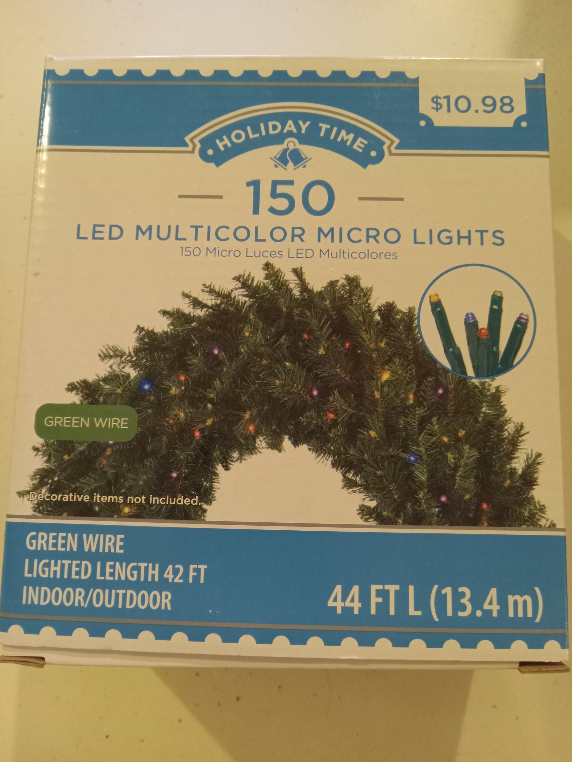 Christmas lights by Holiday Time, with 150 LED micro lights (tiny bulbs), ideal for small trees and wreaths, multi-color on green wire, indoor and outdoor.