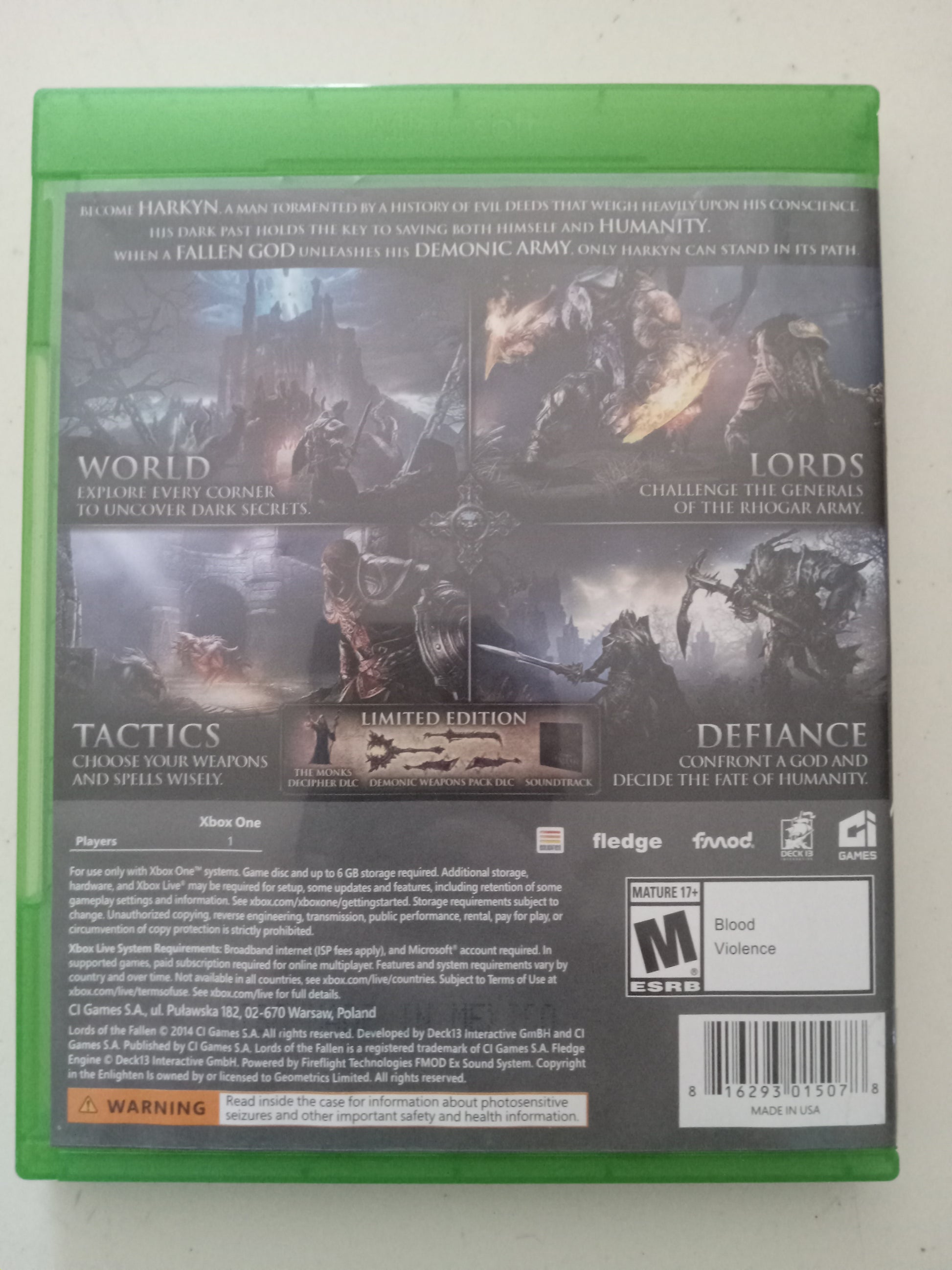 Lords Of the Fallen, Limited Ed. Xbox One Video Game, Rated M, USED. This item is used in excellent condition. Game disc is in excellent condition with no scratches and guaranteed to play without any problems. Case is in great condition with light minor wear and scuffs.