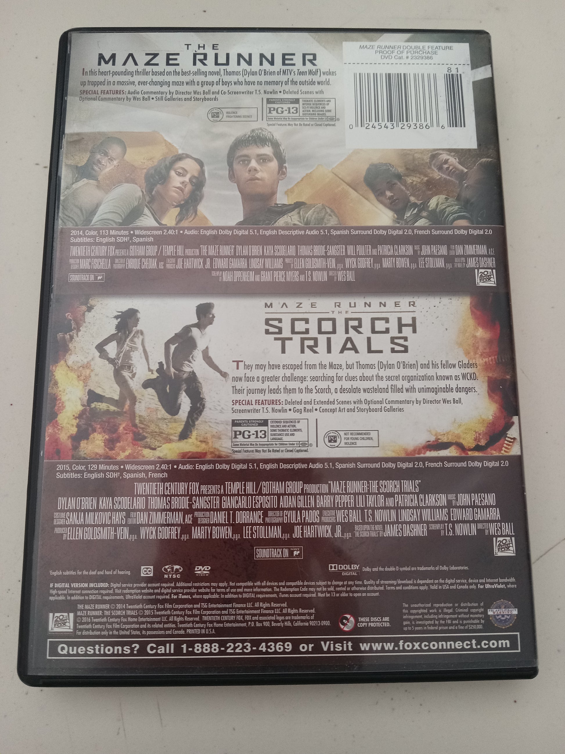 THE CASE ARTWORK ADVERTISES TWO FEATURE FILMS IN THIS CASE. BUT THERE IS ONLY THE MAZE RUNNER DISC INSIDE THE CASE. THE SCORCH TRIALS MOVIE IS NOT INCLUDED. Sorry.