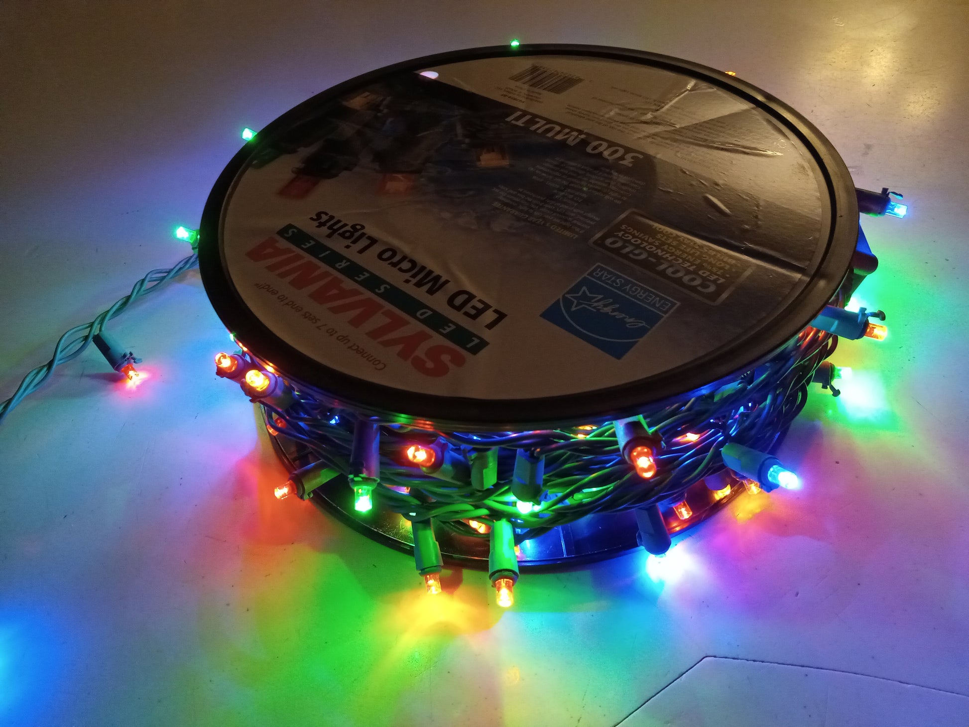 Christmas lights roll by Sylvania with cool glo technology, of 300 LED micro lights, multi-color on green wire, indoor and outdoor.