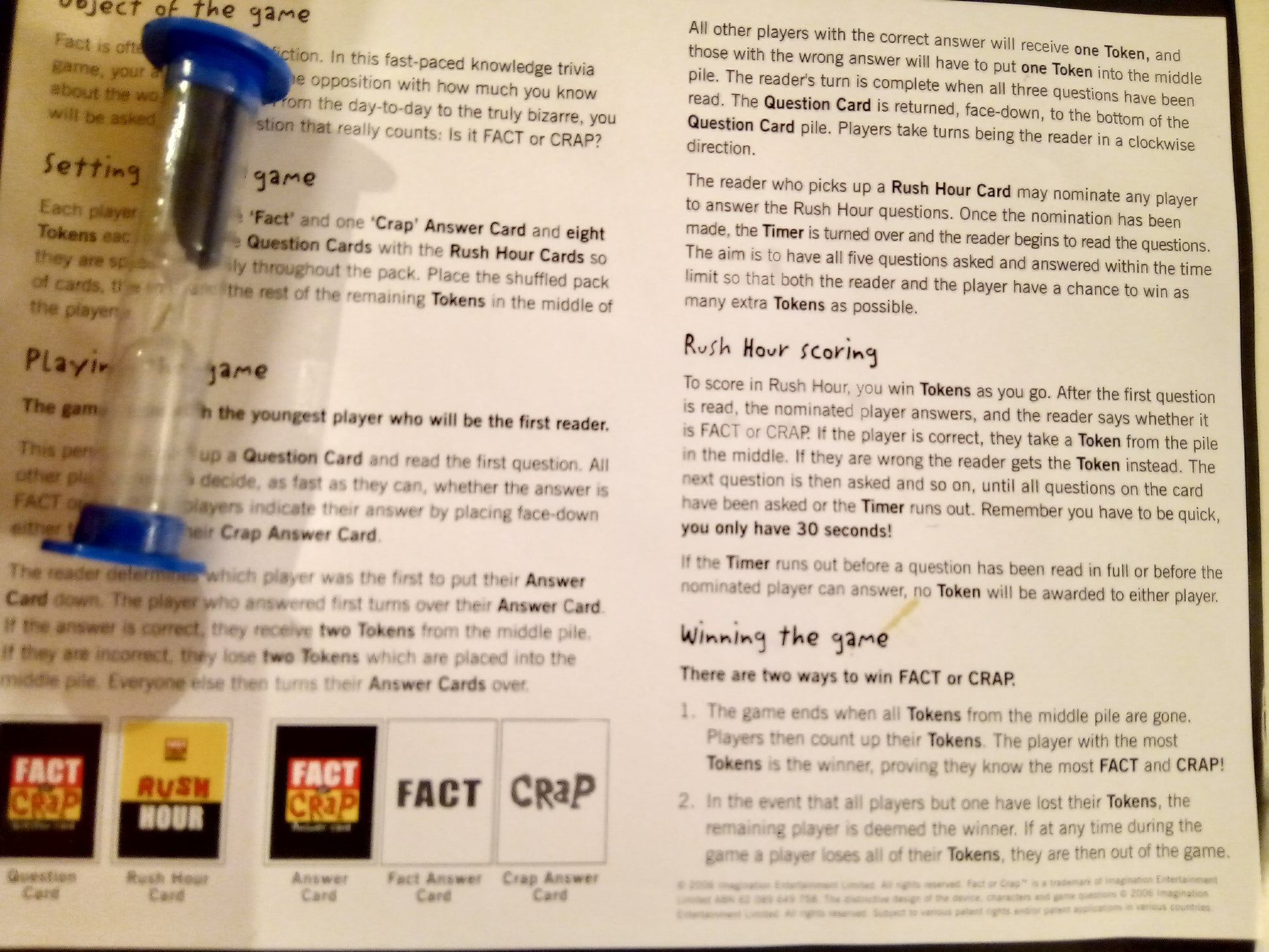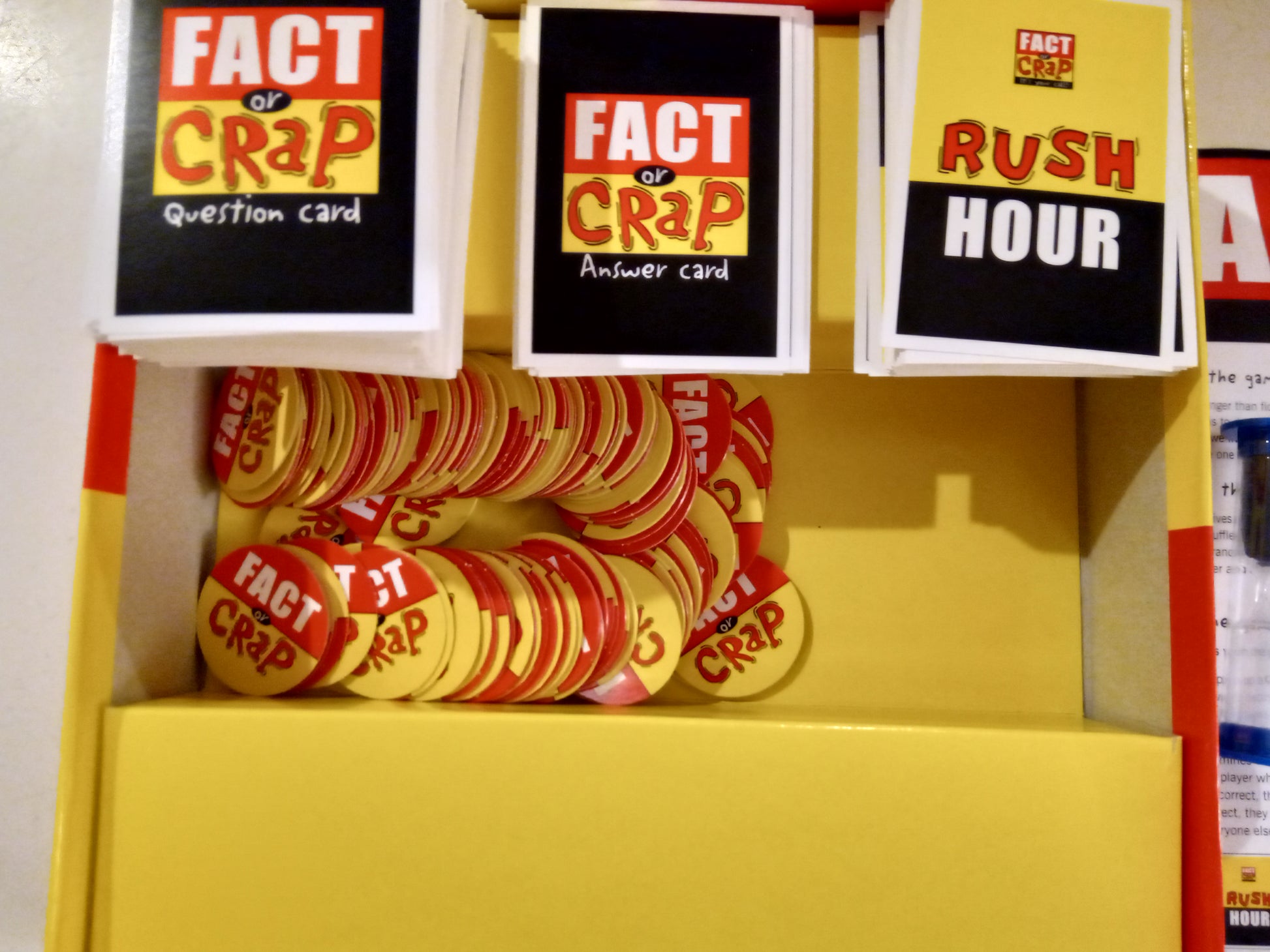 This Fact or Crap game is used but in complete condition. It consists of cards, tokens, a timer and instructions.