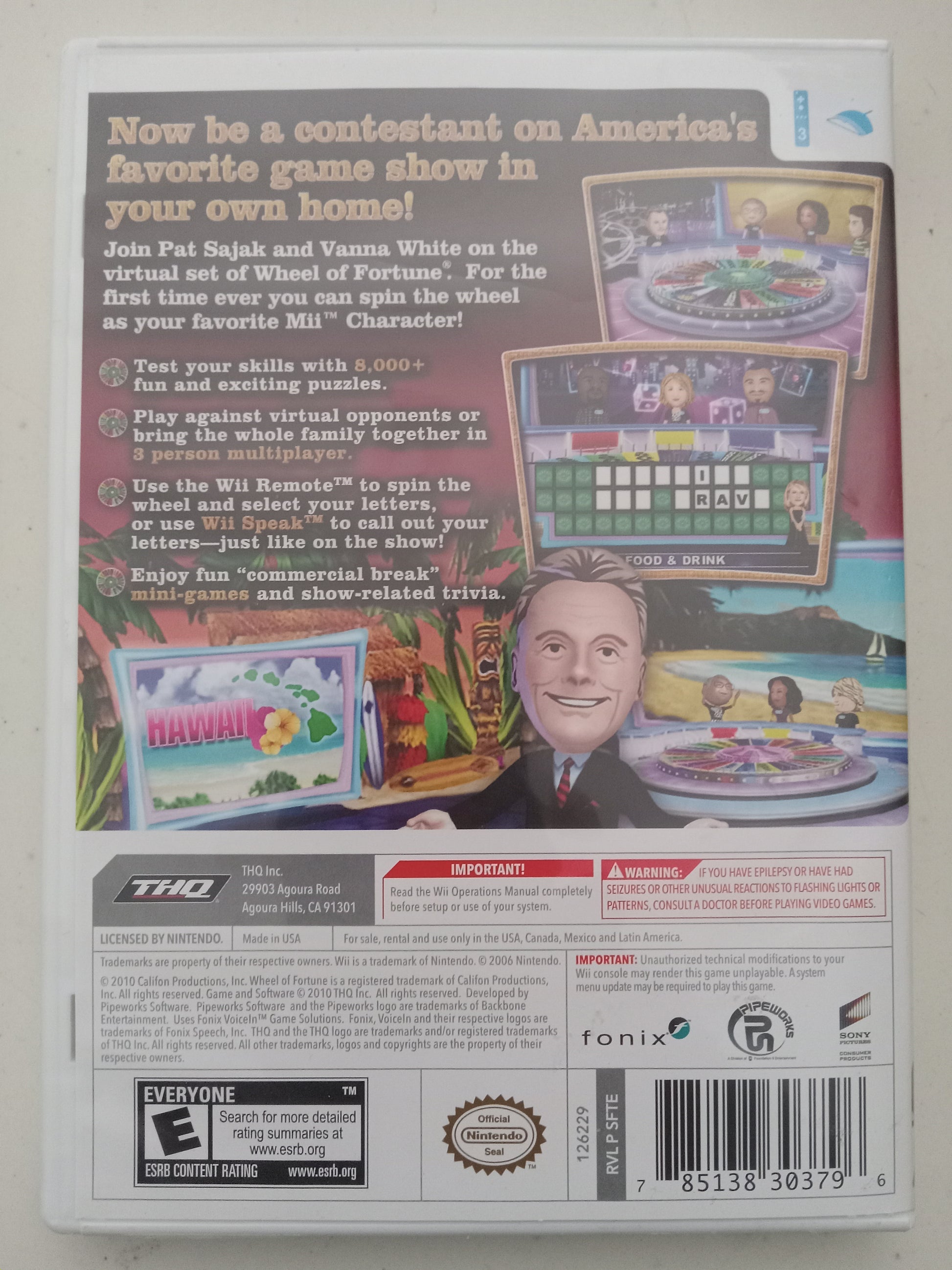 Wheel of Fortune Wii Video Game, Rated E, USED. This item is used in excellent condition. The game disc is in like new condition. The case is in great condition with minor scuffs and wear.